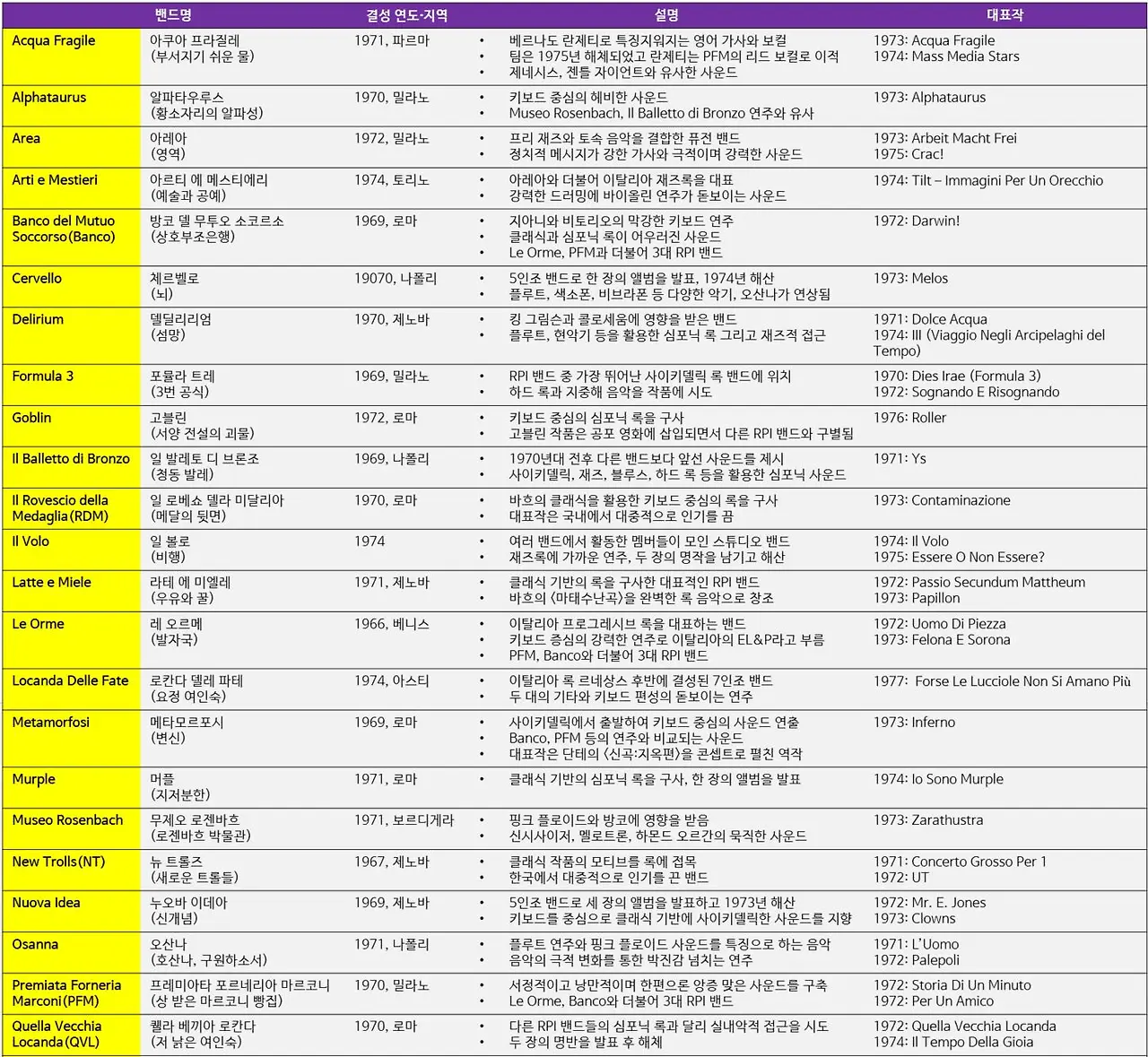국내에 RIP 밴드가 소개된 계기는 DJ 성시완의 역할이 컸습니다. 1980년대 중반 그의 라디오 프로그램을 들으며 성장한 세대는 이제 50대 이상의 중년이 되었습니다. 아래표는 수백개의 밴드들 중 개인적인 선호도와 추억을 바탕으로 상대적으로 두각을 나타낸 이들을 정리한 것입니다. 프로그레시브 록 애호가들은 이탈리아 밴드들을 다시 되새기는 계기가 되길 바랍니다. 입문하는 분들은 영국을 대표하는 밴드들을 우선 감상하신 후 아래의 밴드들과 대표작을 통해 음악의 폭을 넓히시면 좋겠습니다.