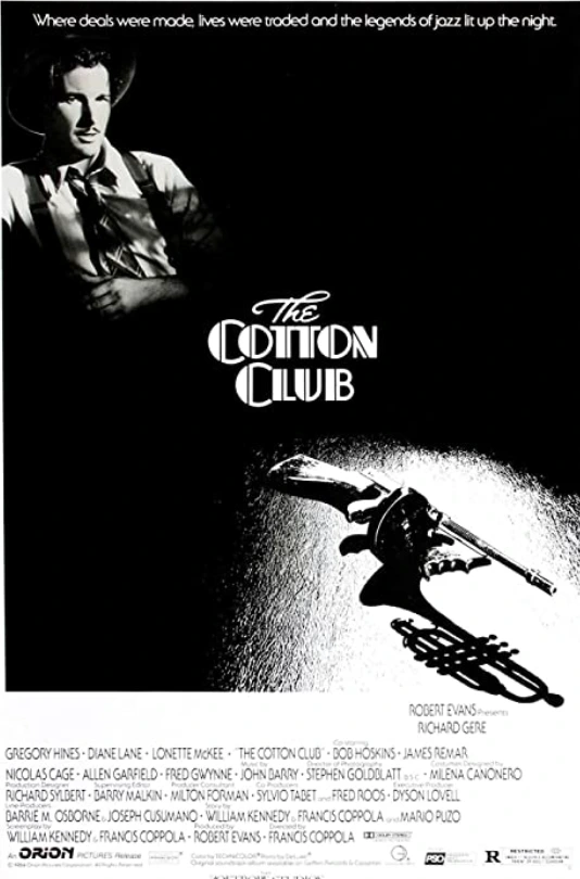 1970년대 대부, 지옥의 묵시록 등 명작을 만든 코폴라는 캘리포니아주 나파에서 포도농장을 운영하고 있습니다. 1980년대 주요작을 발표하였는데 이중 하나가 <코튼 클럽>입니다. 이 작품은 할렘가 코튼 클럽에 대한 코폴라의 존경을 담고 있습니다. 뉴욕주 맨해튼의 할렘에 있었던 코튼 클럽은 듀크 엘링턴 오케스트라 등 스윙 시대를 풍미한 밴드들이 공연하던 장소입니다. 재즈 역사와 함께 한 이 클럽의 1928년부터 1930년대를 코폴라는 재즈 뮤지션, 댄서, 갱단 손님과 클럽 주인을 중심으로 따라갑니다. 거액의 제작비를 들였고 출연진이 매우 많으며 무대, 세트, 조명, 의상 등 볼거리가 꽤 됩니다만 흥행은 저조했습니다. 재즈 연주와 더불어 리처드 기어와 다이안 레인의 젊은 시절 연기를 볼 수 있기에 의미 있습니다.