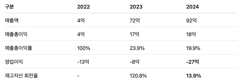 가장 먼저 눈에 띄는 것은 매출의 폭발적인 증가다. (22년 4억 → 23년 72억) 그리고 22년에는 매출액과 매출총이익이 동일한데, 매출총이익은 매출액에서 매출원가를 뺀 금액이다. 즉, 22년에는 매출원가가 없는 수수료성 모델 또는 컨설팅 위주의 파일럿 수익 구조였을 가능성이 높다.
