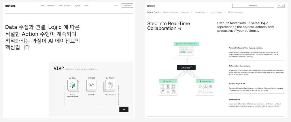 재미있는 점은 홈페이지의 분위기조차 팔란티어와 매우 흡사하다는 것이다. 전달하고자 하는 메시지를 넘어 검은색 계열의 톤, 시스템 다이어그램, 임팩트 중심의 문구, 애니메이션까지. 전달 방식뿐 아니라 톤 앤 매너에서도 팔란티어의 색이 짙게 묻어난다.