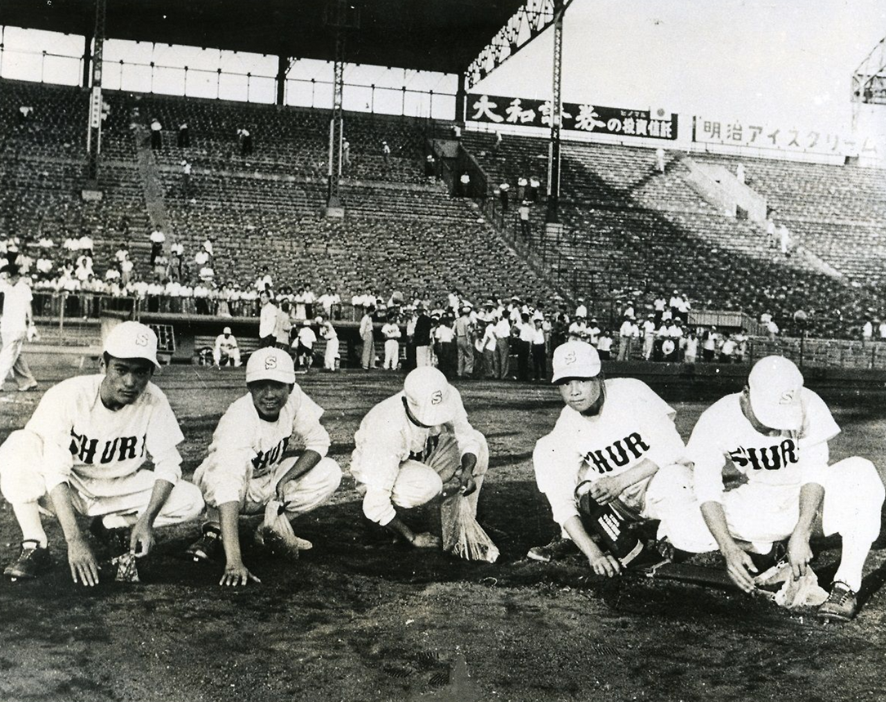 당시의 오키나와는 종전 이후 미국의 지배를 받고 있었습니다. 고시엔의 흙은 미국의 검역방침을 통과하지 못했고 결국 선수들은 니하 항에서 흙을 버려야만 했습니다. 훗날 이 소식을 전해 들은 일본항공의 승무원들이 고시엔 구장 주변의 해변에서 자갈을 주워 슈리고교에 기증해 '우애의 비'라는 것이 생겼다고 합니다.