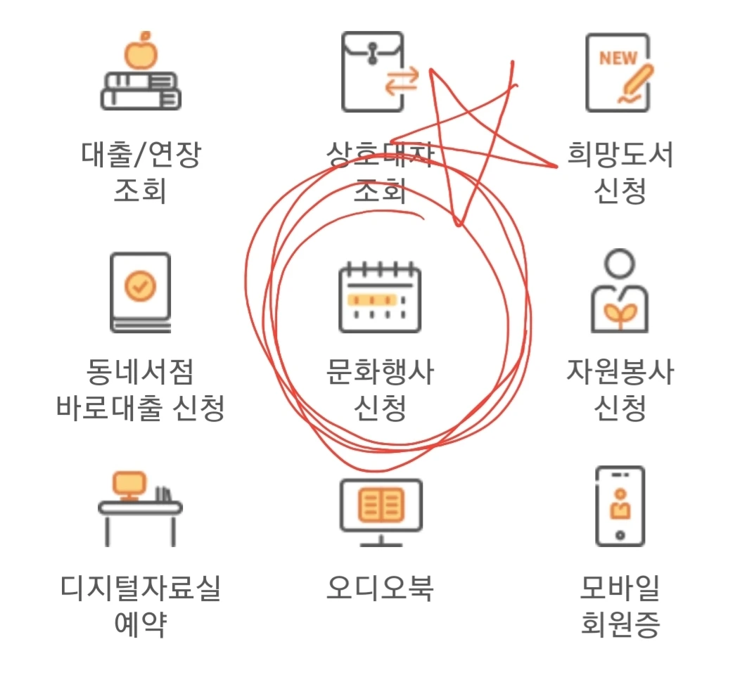 다른 동네 도서를 빌리려면 상호대차를 신청해야 한다. 도서관 앱을 열면 상호대차 바로 아래 '문화강좌'라는 버튼이 있다.