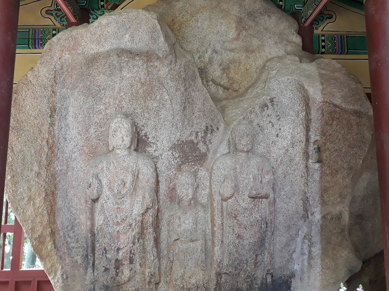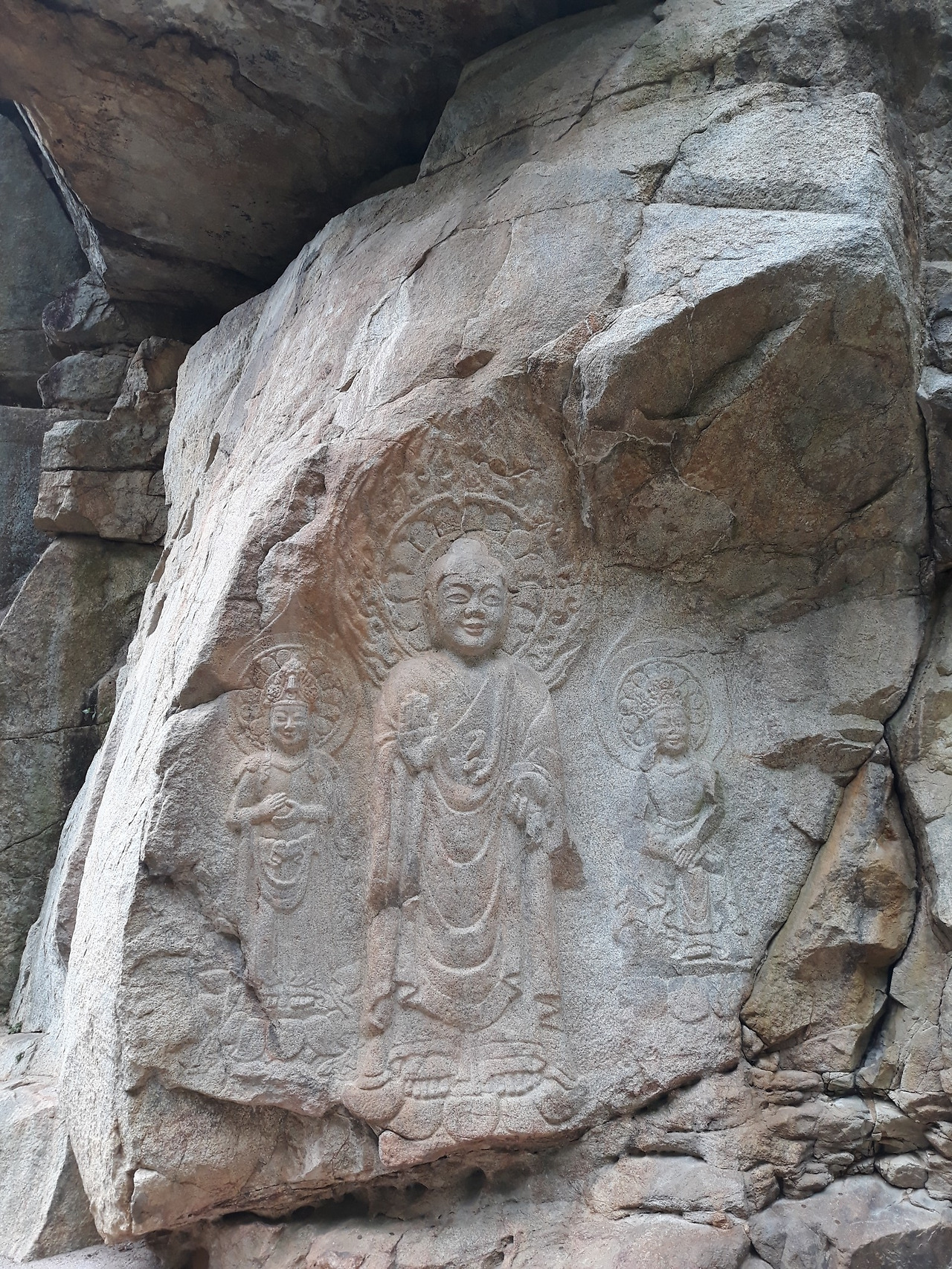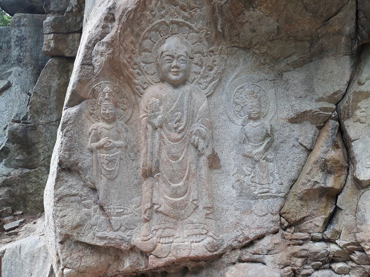 태안 마애삼존불. 마애불을 보면 비스듬한 바위벽에 불상을 새기고, 얼굴과 몸통 쪽을 많이 파낸 것이 확연히 보인다.