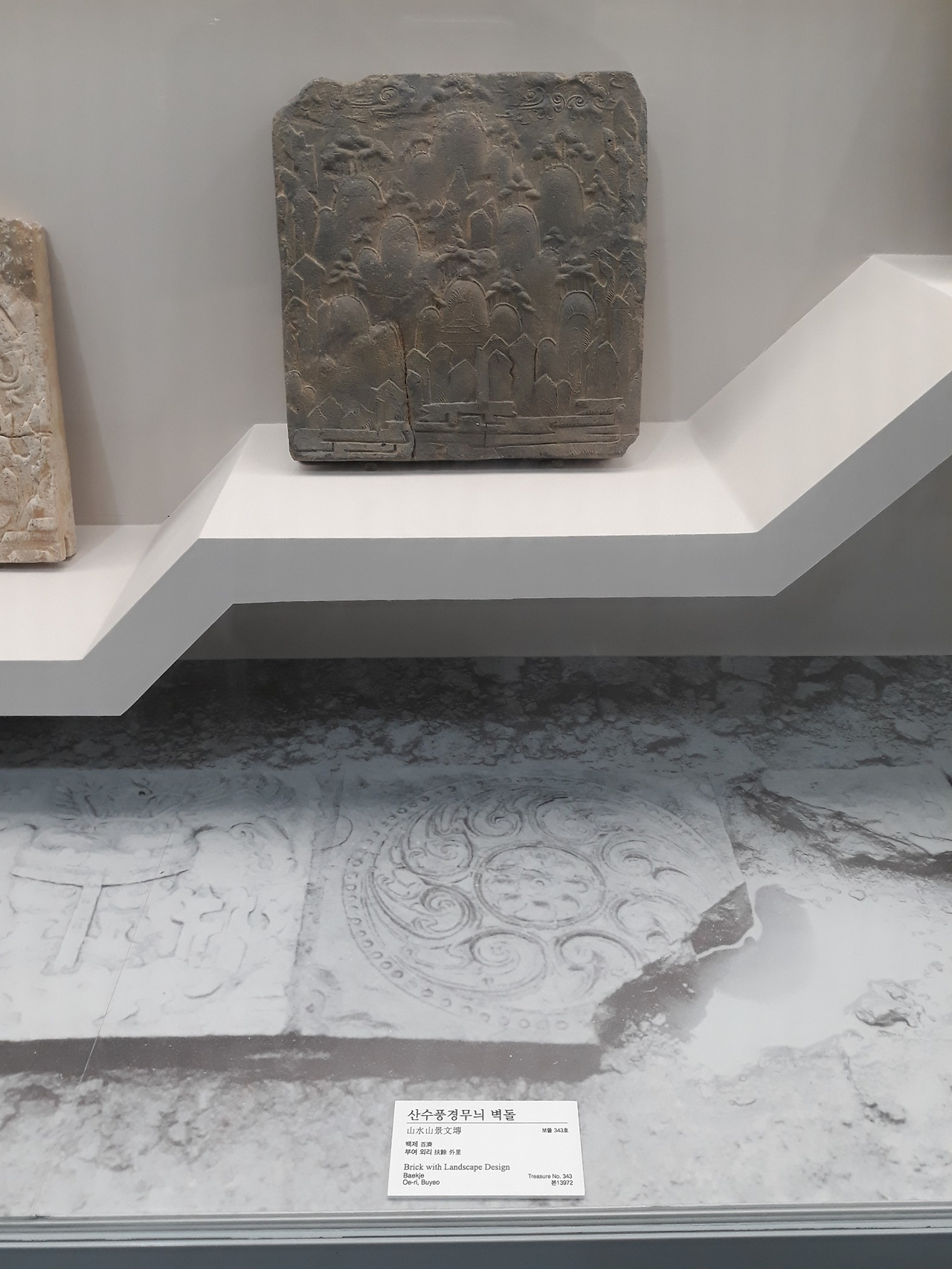 백제의 뛰어난 예술성을 보여주는 벽돌. 특히 산수풍경무늬 벽돌은 '산수문전'이라는 이름으로 유명하다(좌측 위).