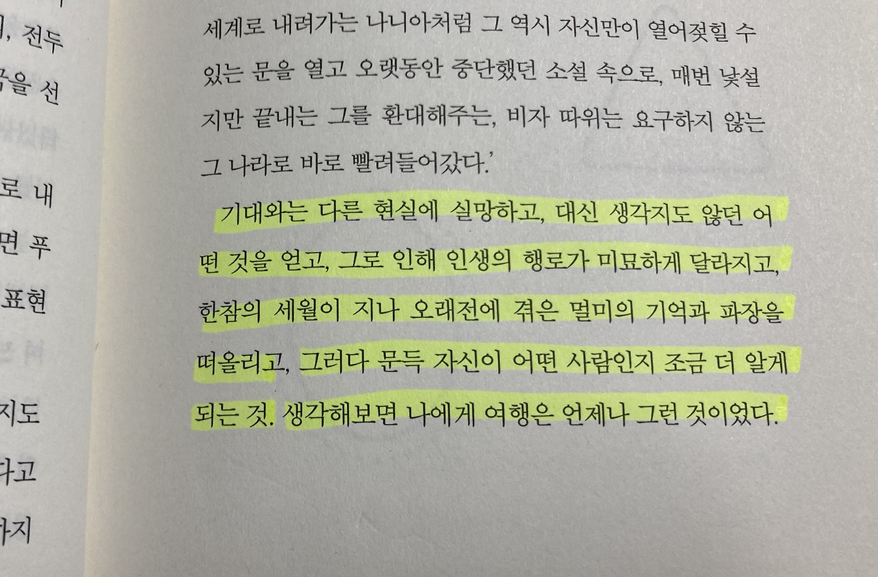 기대와는 다른 현실에 실망하고, 대신 생각하지 않던 어떤 것을 얻고, 그로 인해 인생의 행로가 미묘하게 달라지고, 한참의 세월이 지나 오래전에 겪은 멀미의 기억과 파장을 떠올리고, 그러다 문득 자신이 어떤 사람인지 조금 더 알게 되는 것. 생각해보면 나에게 여행은 언제나 그런 것이었다. (여행의 이유, 51p, 김영하)