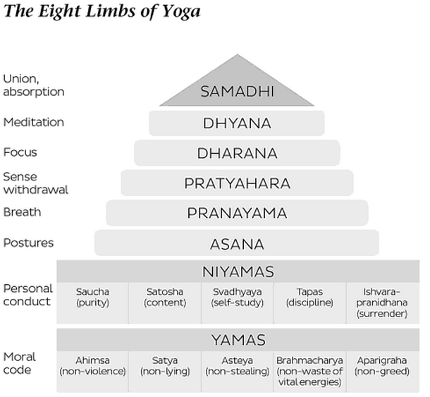 빠딴잘리 성인이 이야기하는 요가의 8단계, 깨달음을 얻을 수 있는 여정의 8단계는 야마, 니야마, 아사나, 프라나야마, 프라티아하라, 다라나, 디야나, 사마디이다. 그 기본에는 사회적으로 지켜야 하는 도덕적인 규칙인 Yama(야마)가 있고, 요가 수행자로서 개인적으로 권고하는 수행인 Niyama(니야마)가 있다. 니야마에는 청결, 만족, 자기 수행, 금욕, 신에게 내맡김이라는 5가지가 있다.