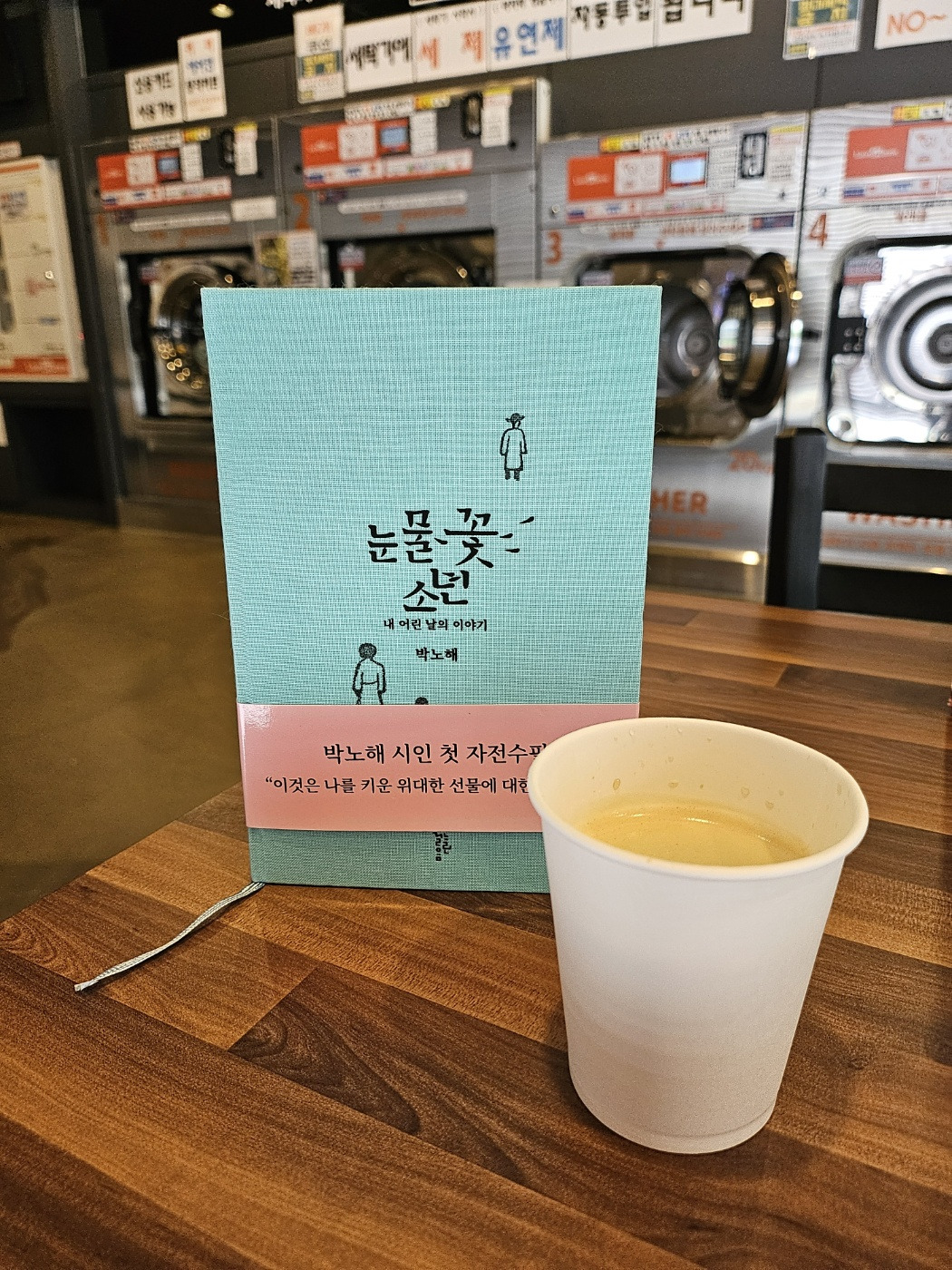 나는 에어컨을 작동시켰다. 둘러보니 고급 커피 자판기도 있다. 오~ 요즘은 빨래방이 좋아졌네. 나는 커피를 한 잔 뽑아 자리를 잡고 앉았다. 가격은 500원인데 맛은 카페에서 마시는 커피 맛 같다. 이렇게 커피를 마시며 탈탈거리는 세탁기 소리를 듣고 있자니~~ 그렇게 나쁘지만은 않다. 아니, 오히려 기분이 새롭고 좋다. 왠지 깨끗해지는 저 빨래들처럼 내 기분도 맑아지는 것 같다. 시간이 좀 걸릴 것을 대비해 챙겨 온 책을 꺼냈다. 박노해 시인의 <눈물꽃 소년>이다.
