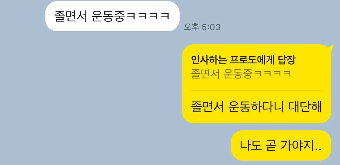 친구가 퇴근을 하고 바로 헬스장으로 간다고 했다. 너무 졸리지만 그냥 간다고 했다. 그리고 지금, 졸면서 운동중이라는 말을 덧붙여 보냈다.