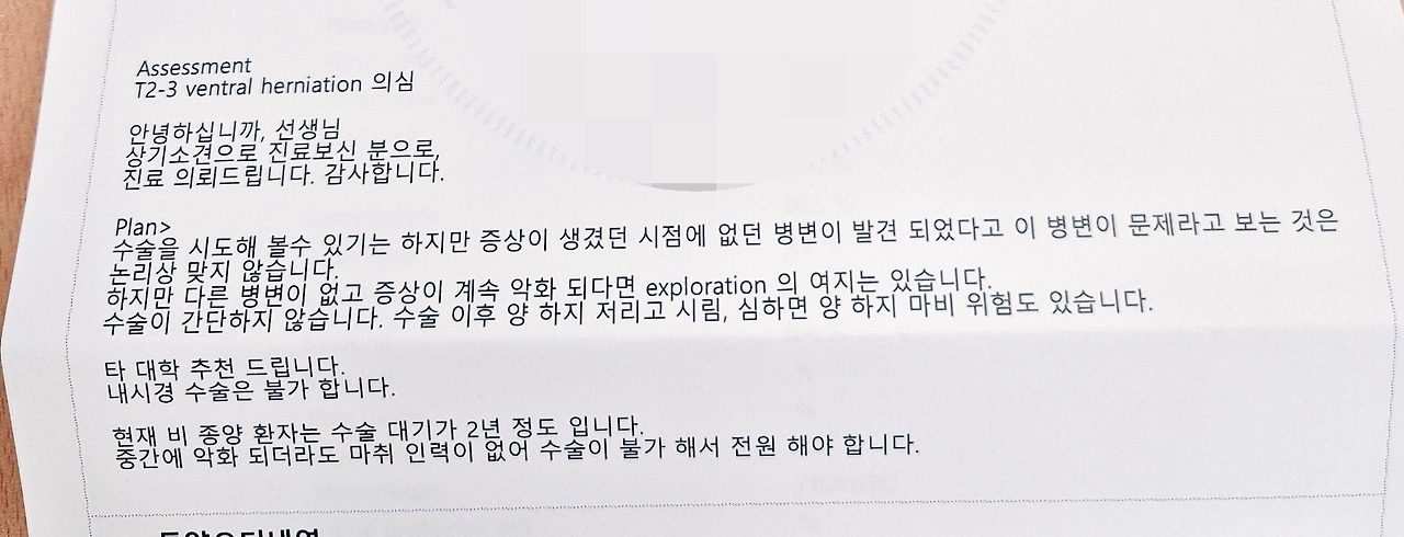 수술이 간단하지 않습니다. 수술 이후 양 하지 저리고 시림, 심하면 양 하지 마비 위험도 있습니다.