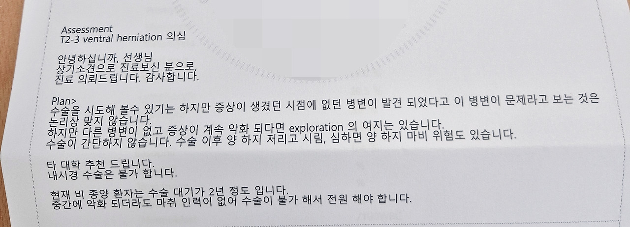 수술 전 진료 때, MRI 영상을 본 선생님은 척수탈출 진단이 명확하다 판단하였고, 그날 바로 수술 날짜를 잡고 가도 된다고 말씀하셨다. 하지 마비 등 ○○대학병원에서 잔뜩 겁을 준 것처럼 그렇게 걱정할 정도는 아니어 보인다고 하면서도 □□대학병원에서 일단 두고 보자고 한 거엔 우리와 마찬가지로 의아해하셨다.
