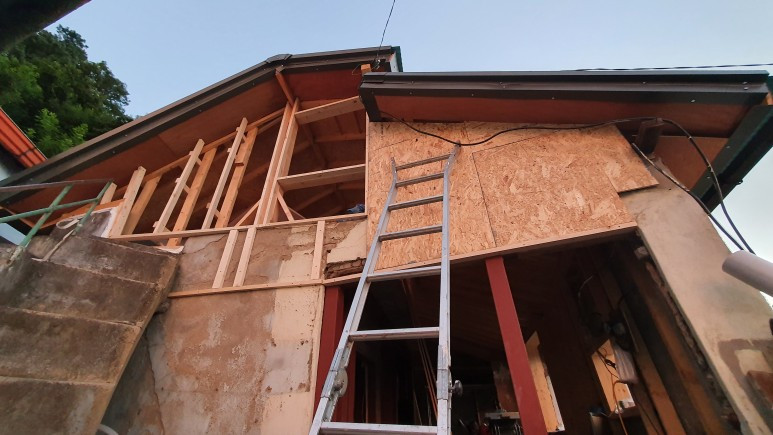 그리고 차양을 만들 구조목을 벽체에 고정했다. 마당에 기름보일러와 기름통을 놓아야 하기에 눈비를 막아 줄 차양은 필수다.