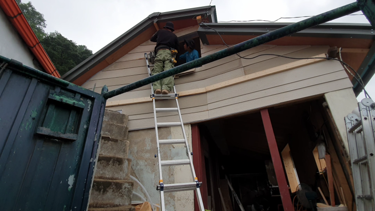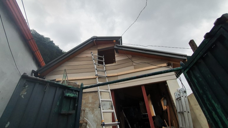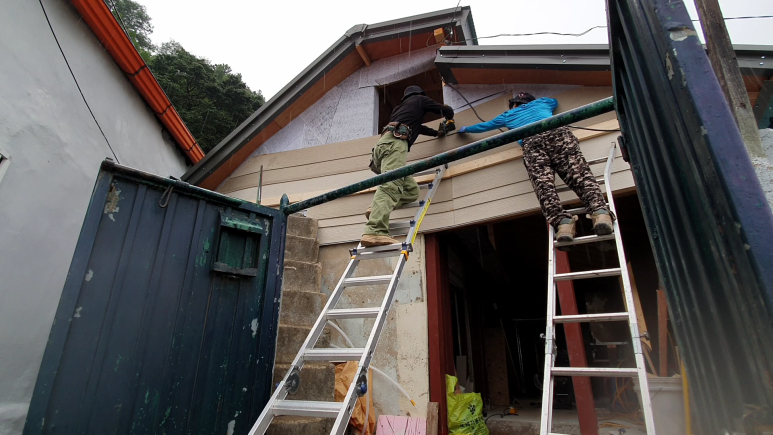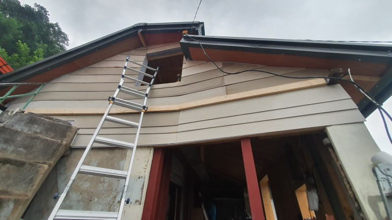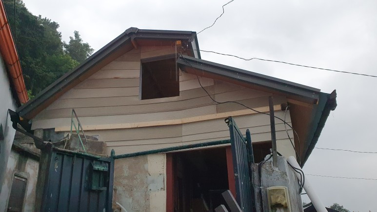 시멘트 사이딩 작업 방법은 아래에서 위 방향으로 작업하면 되는데 시멘트 사이딩을 고정할 수 있게 목공 작업을 해 놓으면 편하다. 시멘트 사이딩의 폭은 230미리인데 30미리씩 겹치면서 위로 올라가면 된다. 겹쳐지는 30미리 부분에 피스로 고정을 하면 된다. 그럼 비 샐 염려도 없다. 시공 후 페인트 마감하면 끝!!