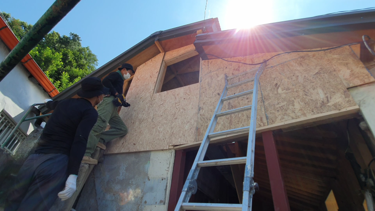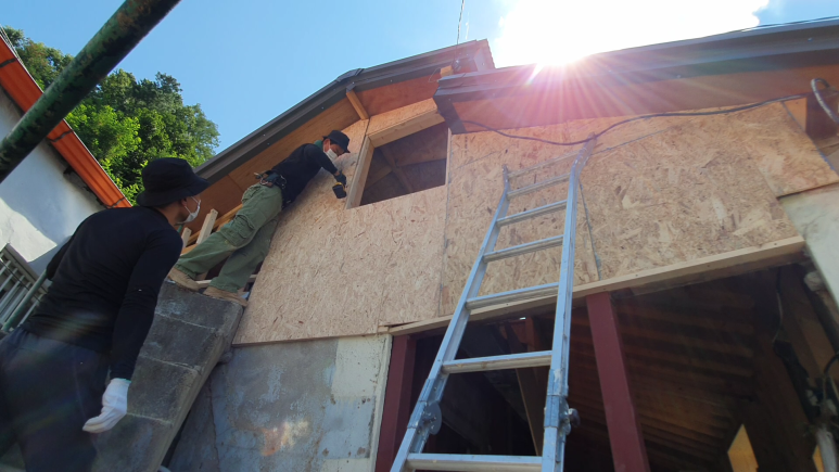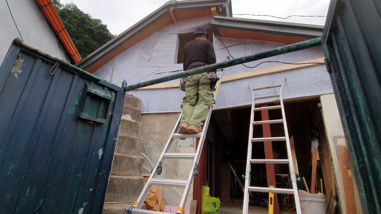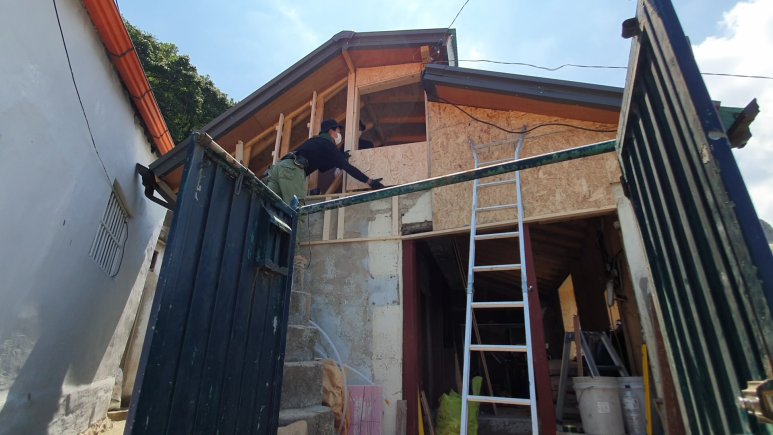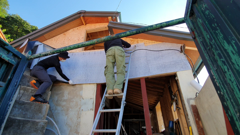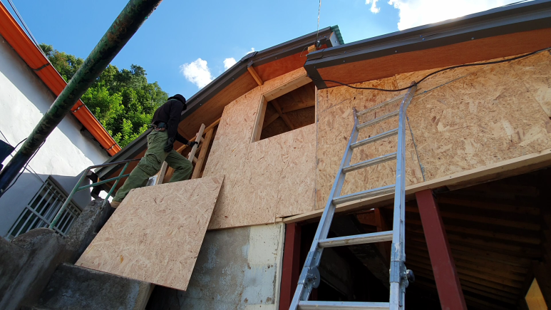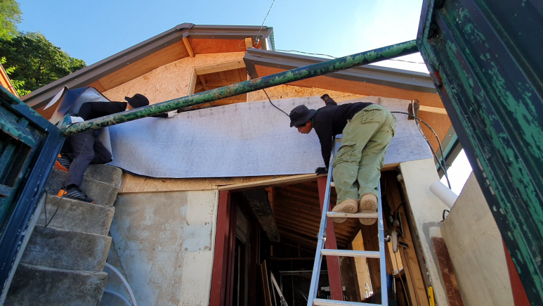 OBS 합판을 시공한 후 방수를 위한 작업을 했다. 지난번에 지붕 공사할 때 썼던 자재와 똑같은 방수 시트를 시공하였다. 방수시트 시공은 아래에서 위로 작업하면 된다. 끈끈이로 되어 있기에 잘 달라붙는다.
