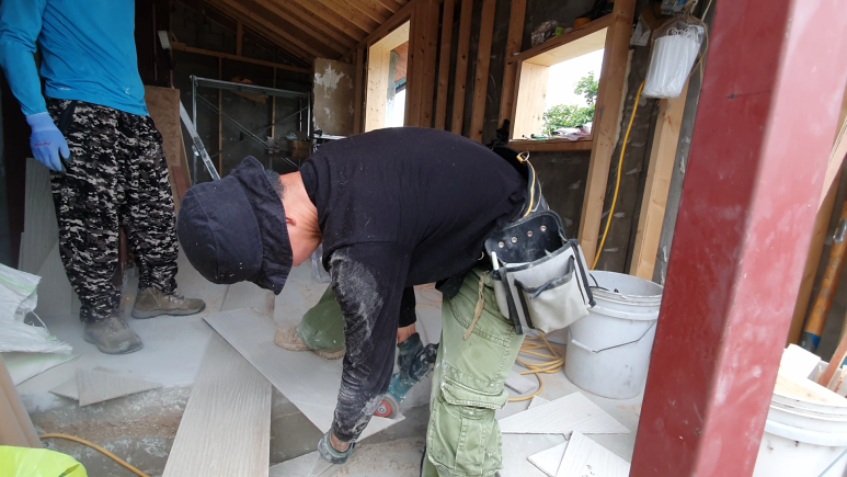 자르기도 편하다. 그라인더에 타일 날을 껴서 잘랐다. 이 집이 참 매력적인 게 반듯한 부분이 하나도 없다는 것이다. 현과 윗벽이 책이 살짝 접힌 것처럼 접혀 있다. 그래서 시공이 간편한 시멘트 사이딩을 고른 이유도 있다.