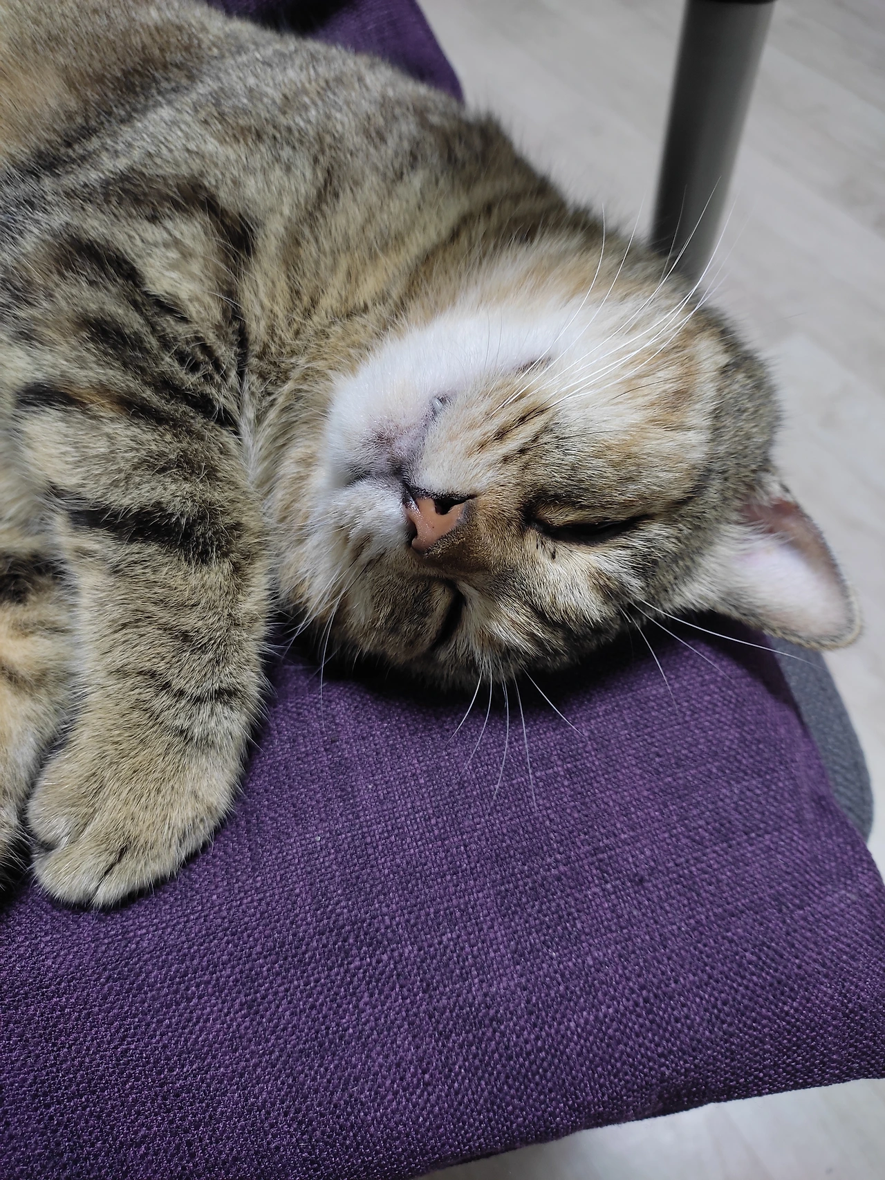이틀 만에 돌아와 깊은 잠에 빠진 고양이를 들여다본다. 온몸의 힘을 빼고 축 늘어져서 바닥으로 꺼져 들어갈 것처럼 앞다리도 쭉 뻗고 얼굴을 바닥에 대고 잔다. 며칠간 떠돌며 제대로 잠도 자지 못했다는 듯이 깊은 잠에 빠진 것 같다. 그러나 눈을 감고도 꼬리만은 깨어 움직이며 주변을 염탐하듯 바닥을 더듬거리거나 살짝 흔드는데 그때의 꼬리는 주변을 탐지하기 위한 맹인의 지팡이 같기도 하고 하등동물의 촉수 같기도 하다. 그 모습은 마치 “나 지금 자는 거 아니거든! 언제든 일어날 수 있으니 허튼짓하지 마. 다 보고 있어..”라고 말하는 경고 같다. 하지만 저 탐사선 같이 배회하는 꼬리만 아니라면 영락없이 죽은 모습이라는 것을 고양이는 아는지.