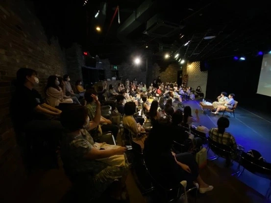 오늘의 행사장은 출판사들이 종종 북토크를 여는 곳이었는데 나는 처음이었다. 소극장 분위기에 100석 규모인데 코로나로 인해 거리두기를 지키며 한 좌석씩 비워두니 대략 45~50명 석이 되었다. 무대는 스크린을 띄울 수 있어 현수막 대신 이미지 한 장으로 대체하면 되고, 의자와 테이블만 두고 심플한 구성이 가능하다. 조명과 음향 담당 직원이 한 분 있구나. 출판사에서는 마케터 두 명, 대표님 한 분이 진행하러 나왔네. 다음에 담당 책의 행사를 하게 될지도 모르니 나도 모르게 매의 눈으로 체크하다 ‘그만 일해’라는 내적 외침이 들려오는 듯도 하다.