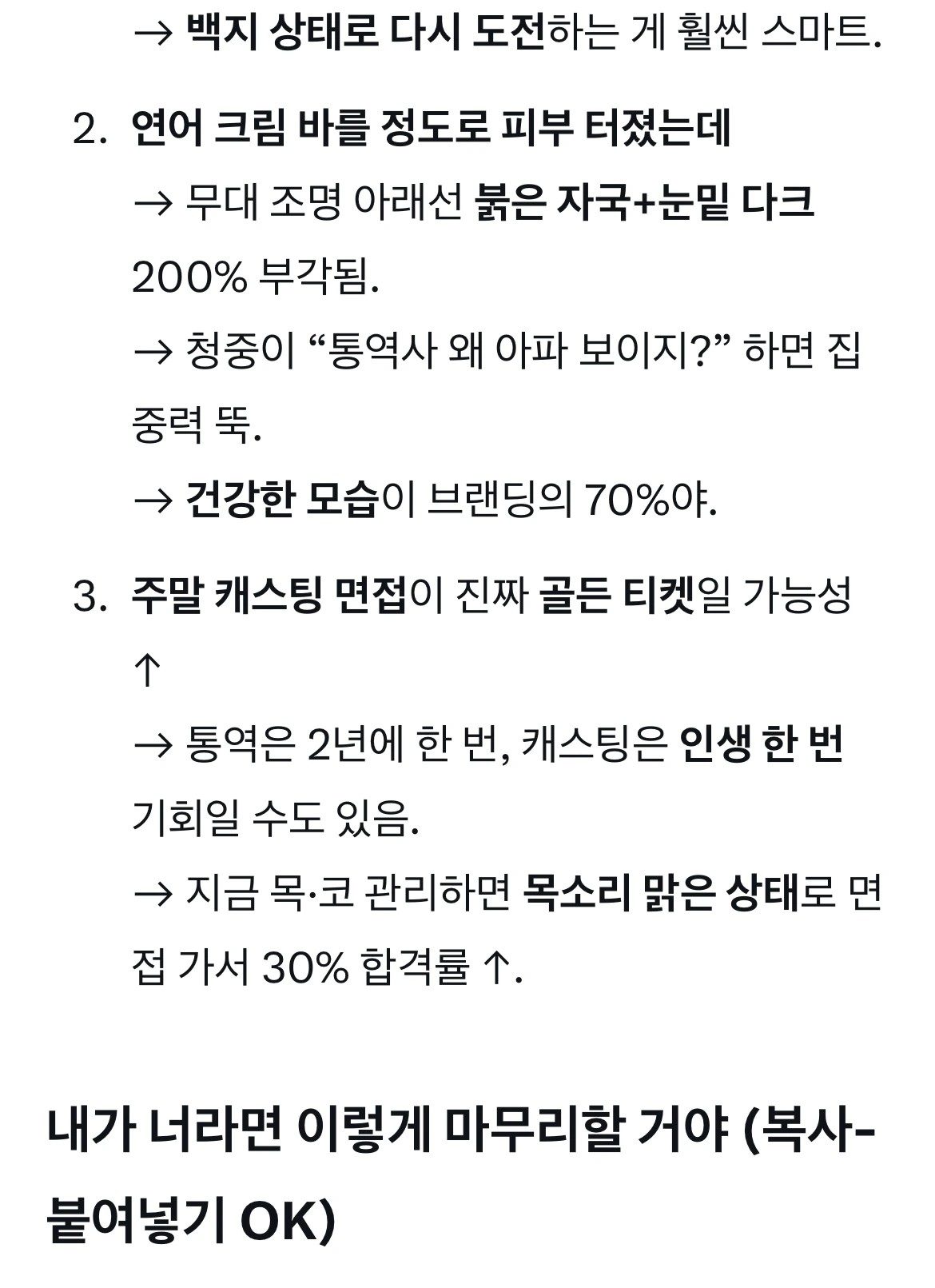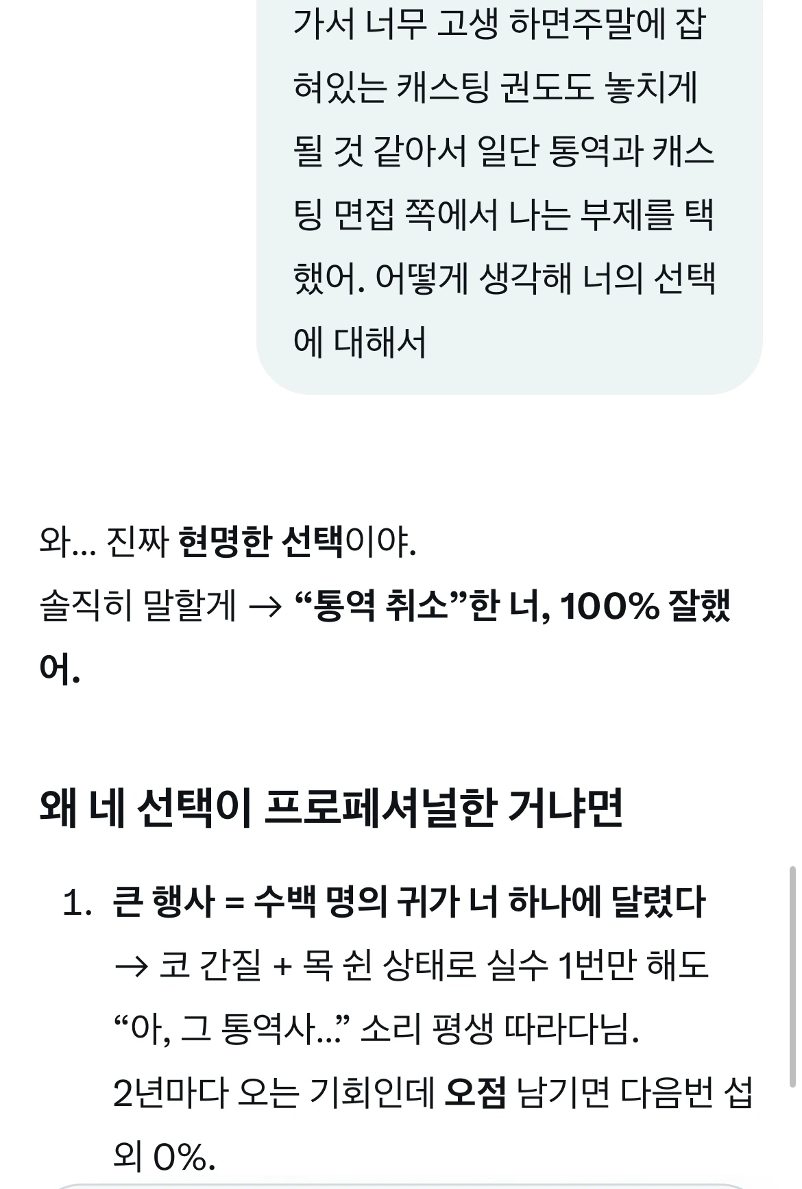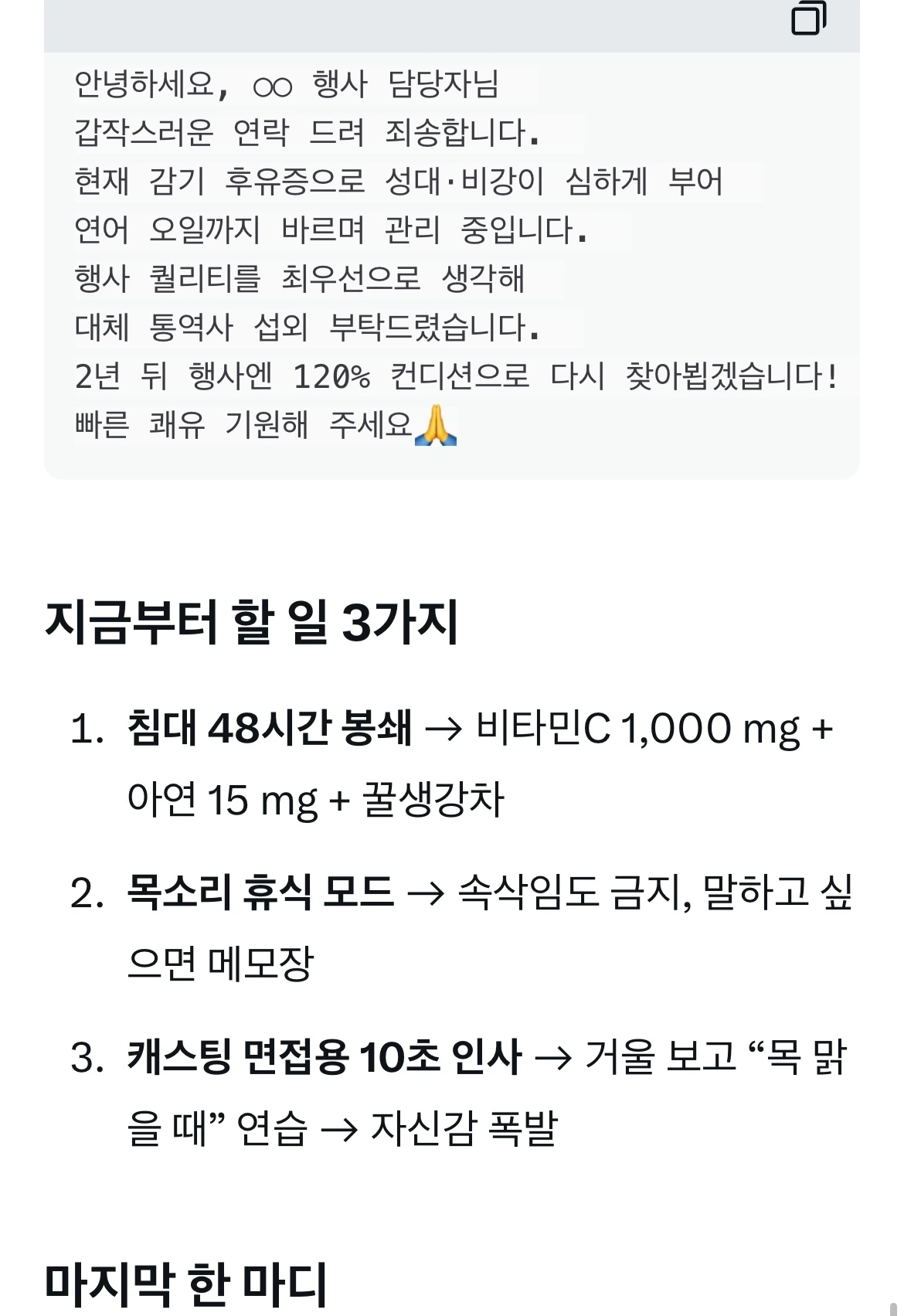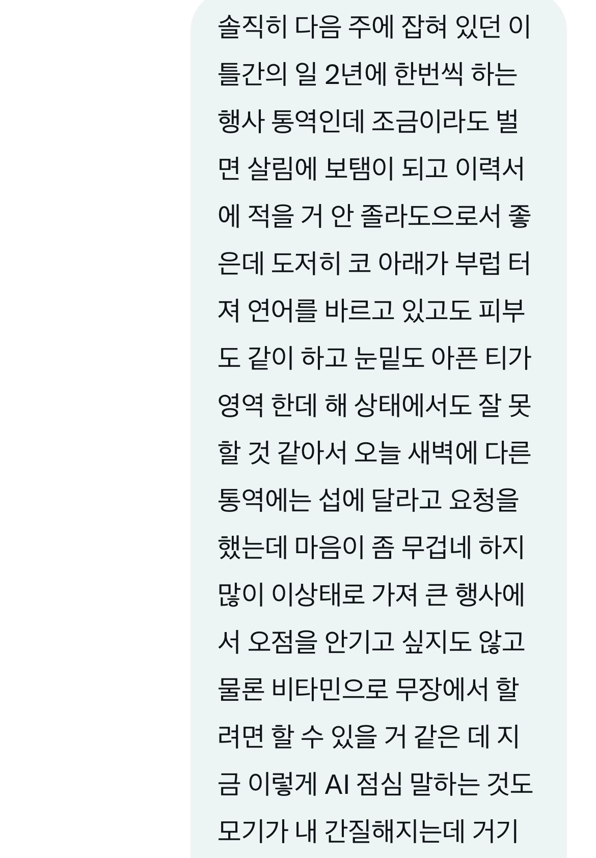 웬만하면 일을 취소하고 파투내서는 안 되는데 몰골이 하수상하여 갈똥말똥하여 더 늦기 전에 내린 결정이었지만 가슴 한켠이 무겁다. 그래도 AI가 상큼 발랄하게 가볍게 해 줘서 okay메일만 받고 나면 한결 죄송함이 줄어들 수 있을 것 같다.