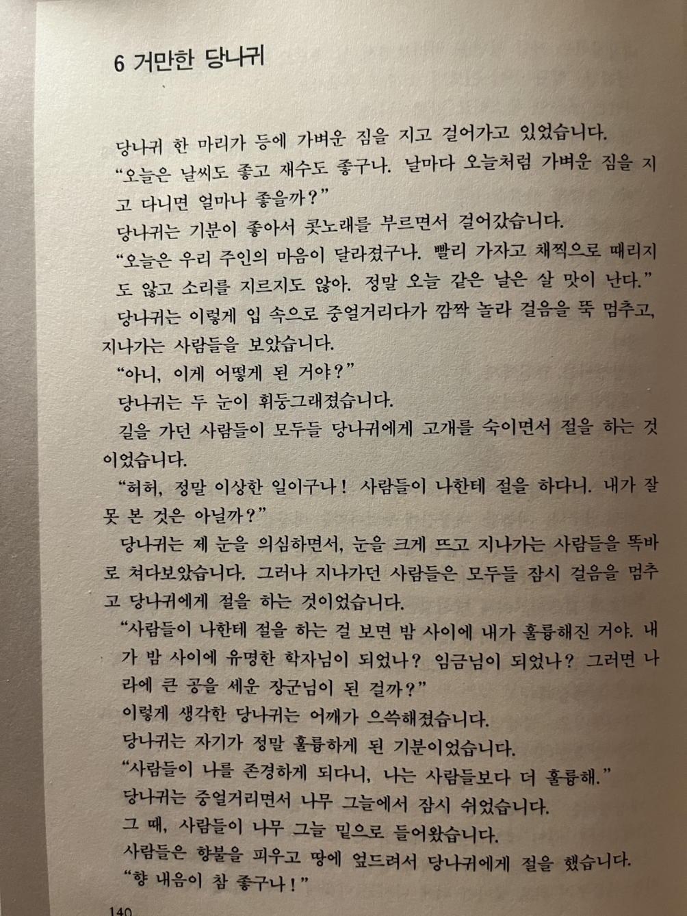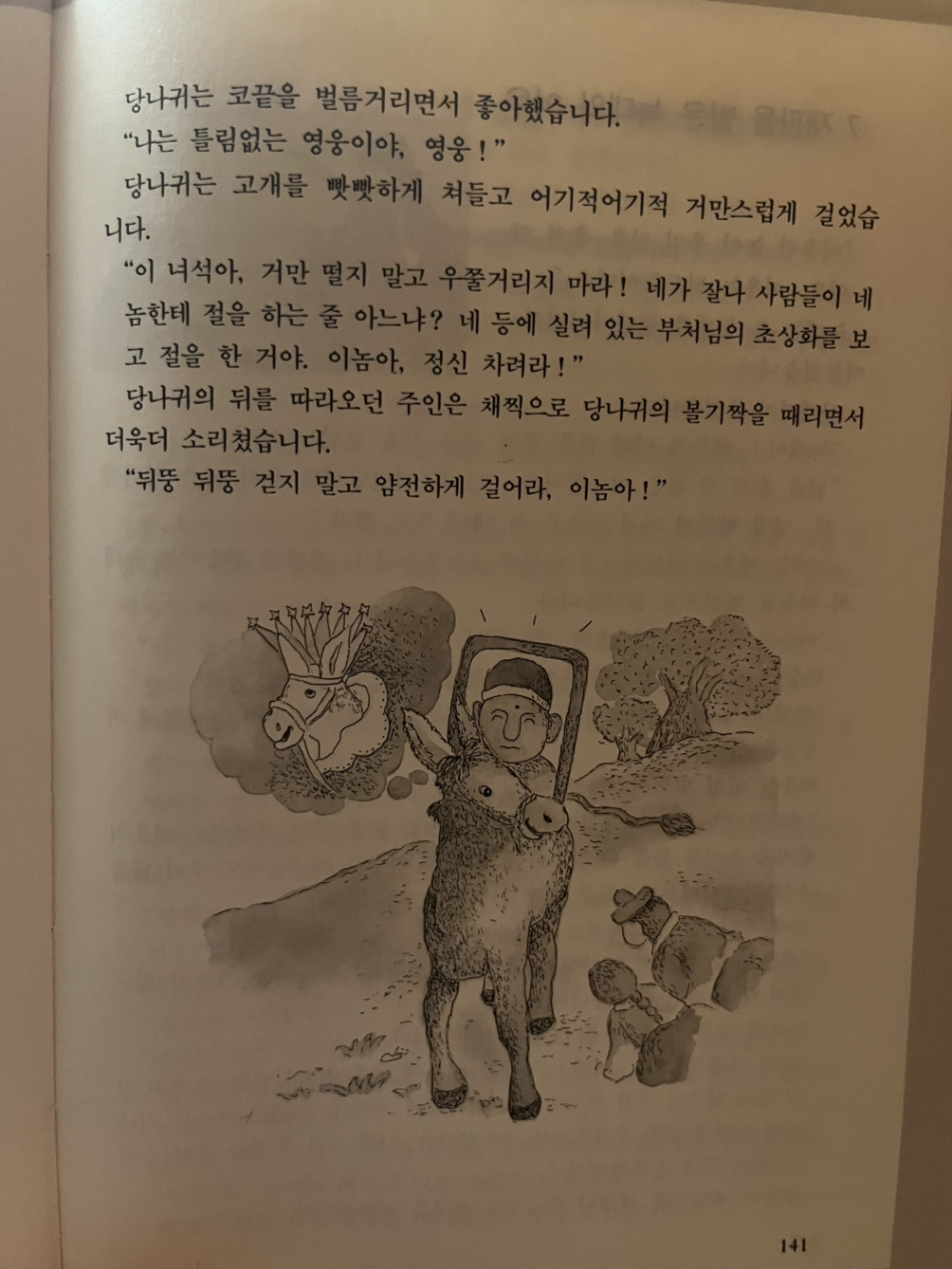참 이상한 일이구나 사람들이 나에게 절을 하다니. 내가 잘못 본 것은 아닐까. 당나귀는 제 눈을 의심하면서 눈을 크게 뜨고 지나가는 사람들을 똑바로 쳐다보았습니다. 그러나 지나가던 사람들은 모두들 잠시 걸음을 멈추고 당나귀에게 절을 하는 것이었습니다.