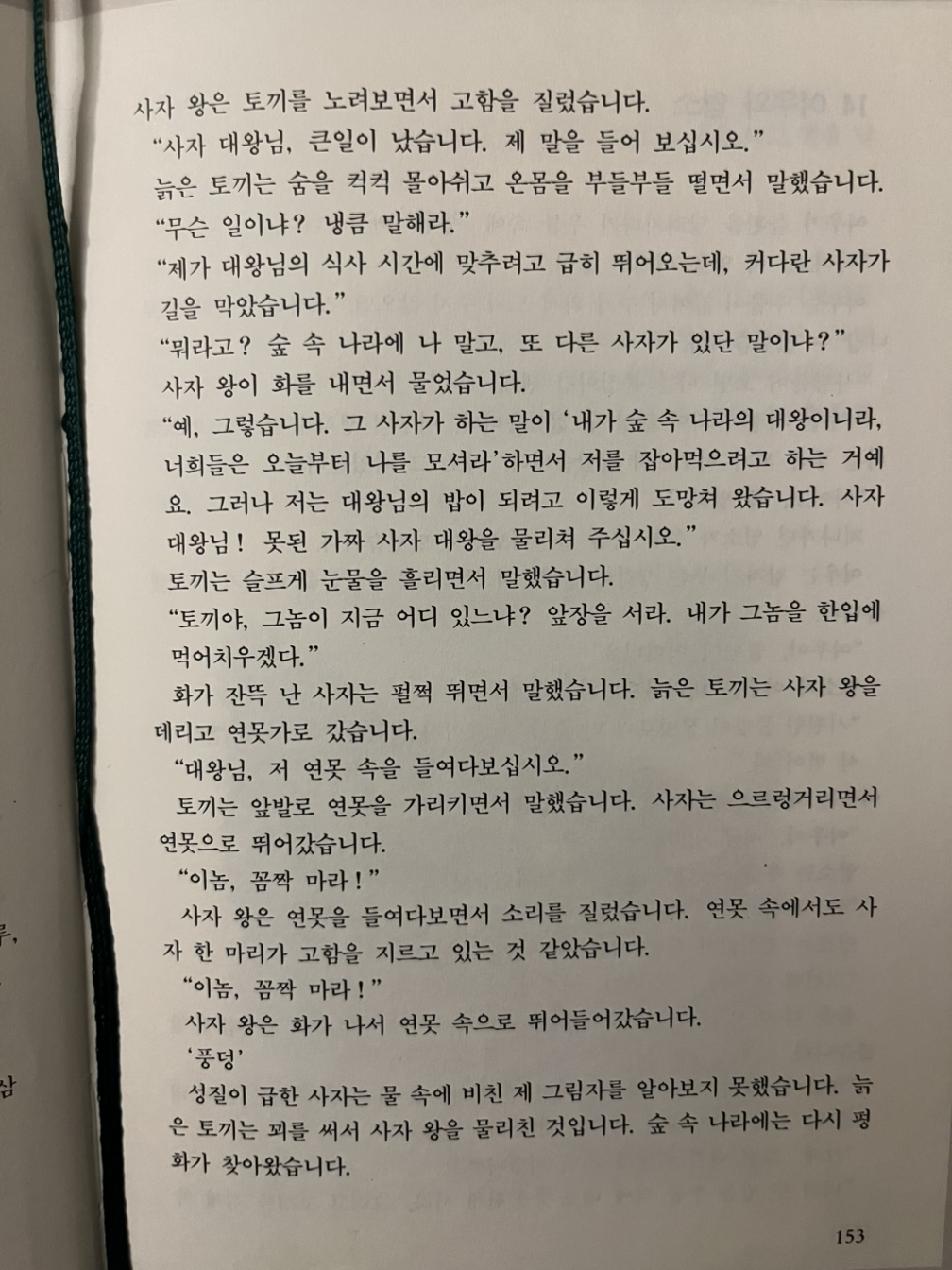 화가 잔뜩 난 사자는 펄쩍 뛰면서 말했습니다. 늙은 토끼는 사자 왕을 데리고 연못가로 갔습니다.
