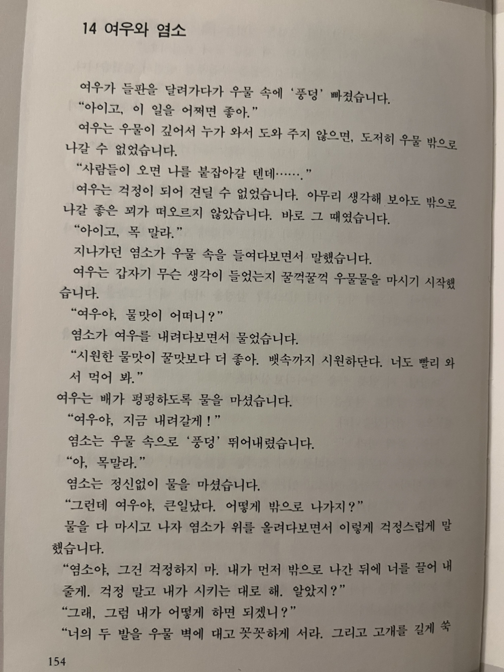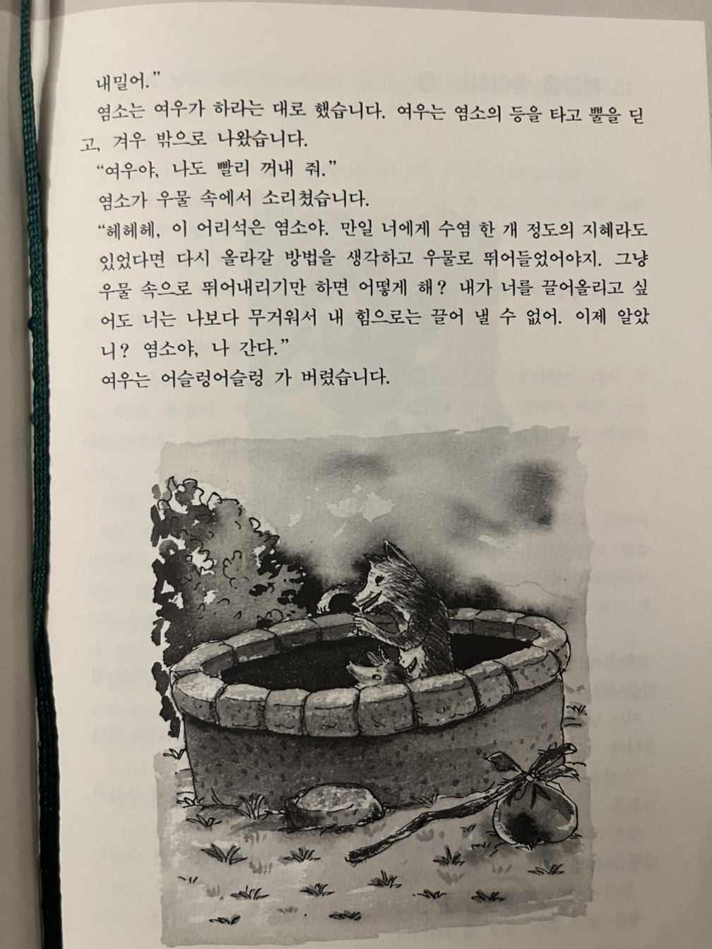 여우가 들판을 달려가다가 우물 속에 '풍덩' 빠졌습니다.