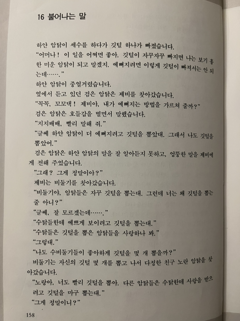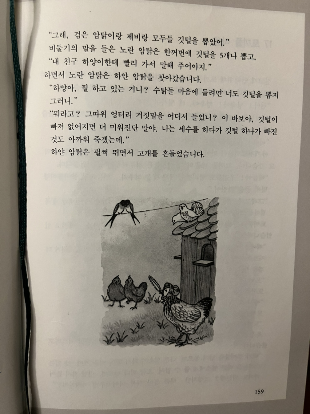 글쎄, 하얀 암탉이 더 예뻐지려고 깃털을 뽑았대. 그래서 나도 깃털을 뽑았어.