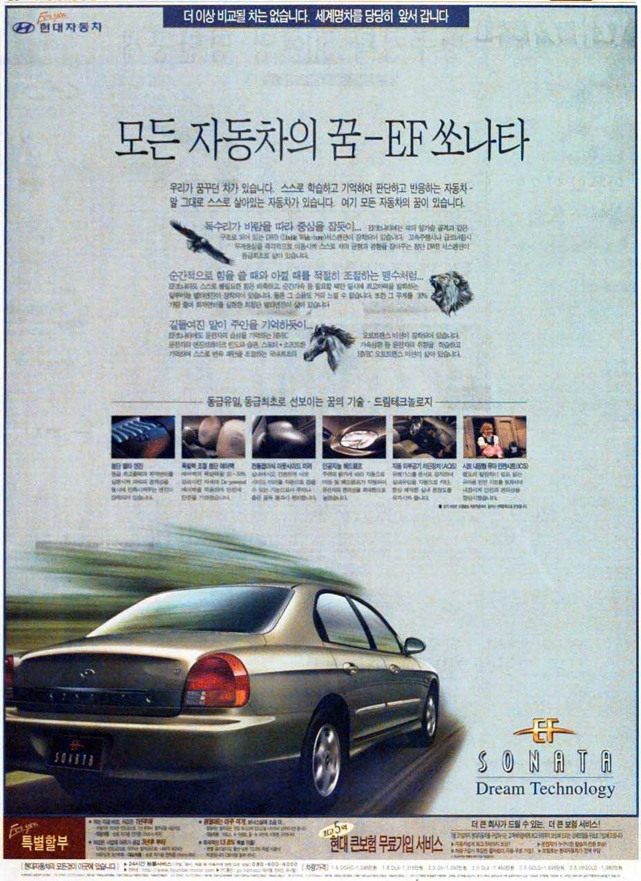 1998년 출시된 4세대 EF 쏘나타는 플랫폼부터 엔진, 변속기까지 모든 것이 현대자동차의 독자기술력으로 개발된 모델입니다. 그만큼 현대차는 EF 쏘나타에 많은 공을 들였고, 이전 세대에서 보지 못했던 사양들을 대거 적용해 고급 중형세단을 표방했습니다.