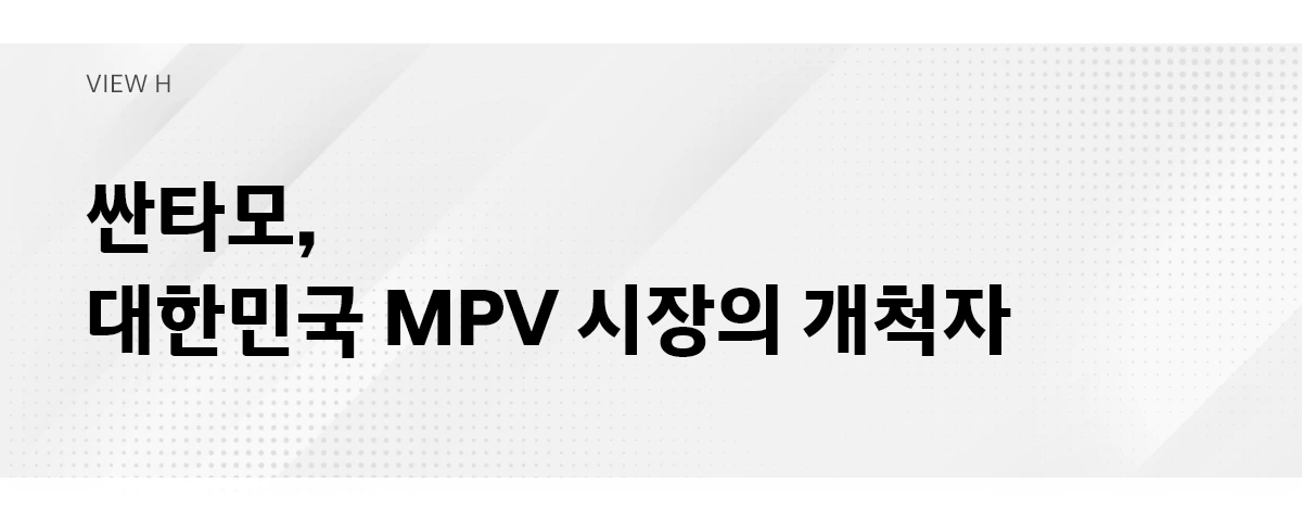 현대차 싼타모는 1996년 출시한 국내 최초의 준중형 RV 차량입니다. 당시 국내에는 생소했던 7인승 MPV(Multi-Purpose Vehicle)라는 카테고리를 만들며, 대한민국 MPV 시장을 개척한 모델입니다. 지금의 7인승 SUV, RV 모델의 필수 요소 중 하나인 시트 폴딩을 통해 침대 또는 화물 적재용으로 사용할 수 있는 기능이 싼타모를 시작으로 확대되기 시작했습니다. 싼타모는 2002년까지 국내 시장에서 사랑받았으며, 강화된 배출가스 규제로 인해 단종됐습니다. 이후에는 시장 변화에 따라 체급을 키운 스타렉스가 승합부터 MPV 시장까지 포괄하는 모델로 개발되고, 오늘날의 스타리아로 이어지게 됩니다.
