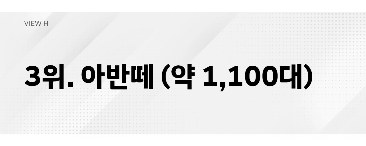 지난해 제주도에서 3번째로 많이 팔린 모델은 준중형 세단인 아반떼입니다. 세부 지역 판매량을 살펴보면 제주시에서 950여 대 서귀포시에서 180여 대가 판매됐는데, 유독 제주시에서 많은 판매량을 보였으며, 전국 판매량의 1.62%를 차지했습니다.