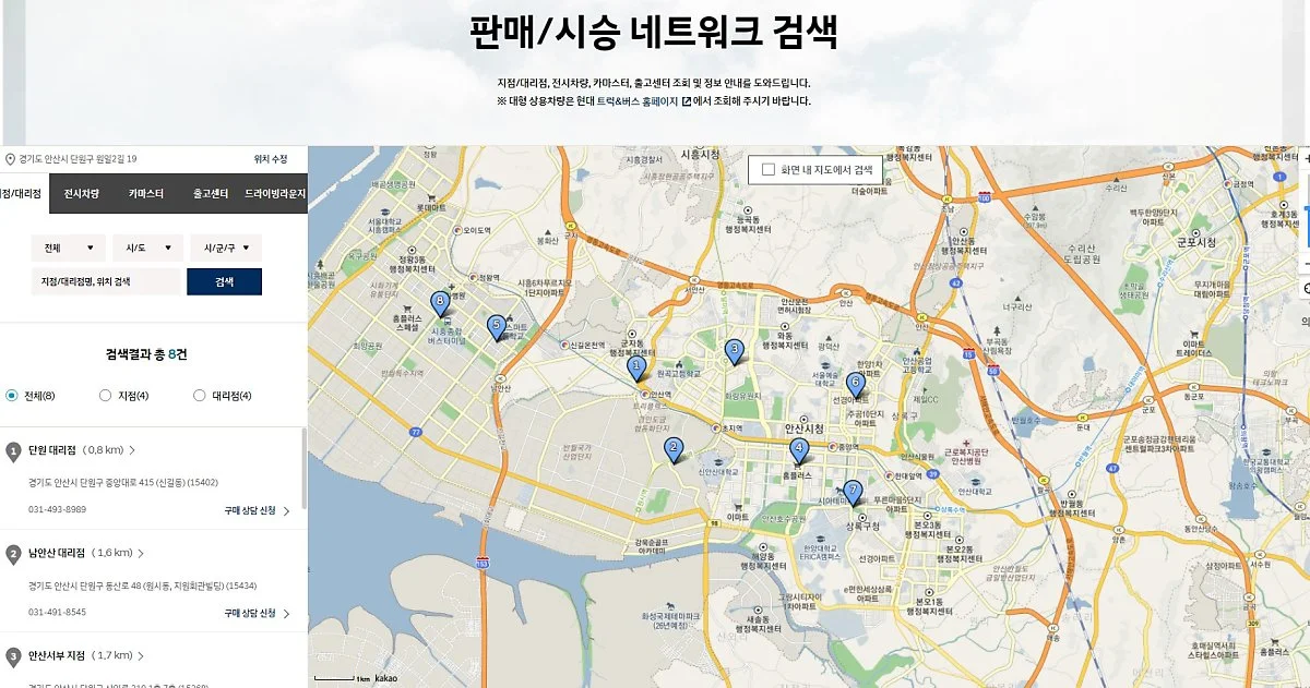 시승에 앞서 차량의 실제 모습, 크기, 색상, 트림 별 사양 등을 직접 눈으로 확인할 수 있는 방법은 현대차 지점 또는 대리점에 방문해 전시 차량을 둘러보는 것입니다. 하지만 각 지점 및 대리점에 현대차의 모든 모델을 전시할 수 없기 때문에 원하는 차량이 전시된 장소를 찾아야 합니다. 그래서 현대차는 고객 편의를 위해 홈페이지에 판매/시승 네트워크 검색 페이지를 운영하고 있습니다.