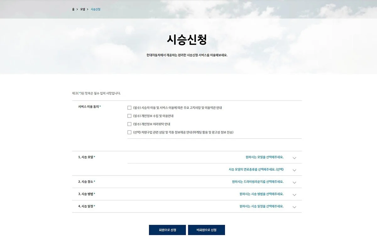 현대차는 차량 구입 전 고객이 차량을 직접 운전해 보고, 경험해 볼 수 있는 드라이빙 라운지(시승 센터)를 전국 28곳에서 운영하고 있습니다. 현대차 시승신청(바로가기)페이지를 통해 신청할 수 있으며, 원하는 시승 모델과 파워트레인을 선택합니다. 이후 가까운 시승 장소를 지정한 후 날짜와 시간을 예약할 수 있습니다.