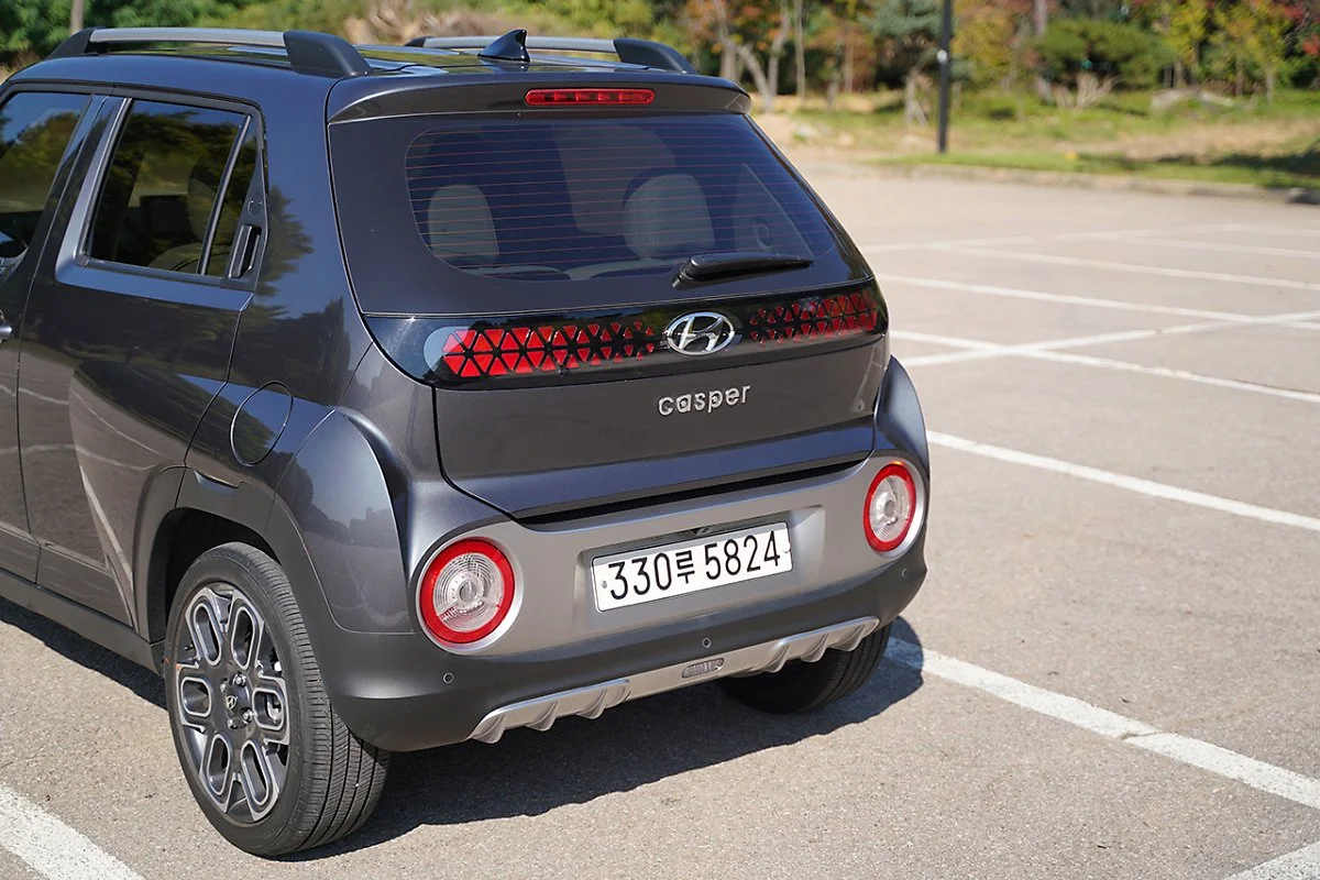 캐스퍼와 캐스퍼 밴의 후면 디자인은 비슷하지만, 캐스퍼 인스퍼레이션 트림에서는 LED 리어콤비램프가 적용되어 야간에 조금 더 고급스러운 분위기를 연출합니다. 캐스퍼 밴은 화물 적재를 위한 차량인 만큼 유리 안쪽에 위치한 보호봉을 설치했고, 테일게이트 우측 하단에 최대 적재량을 표기했습니다. 캐스퍼 밴의 최대 적재량은 300kg으로 일반 캐스퍼 SUV 모델보다 여유로운 적재가 가능합니다.