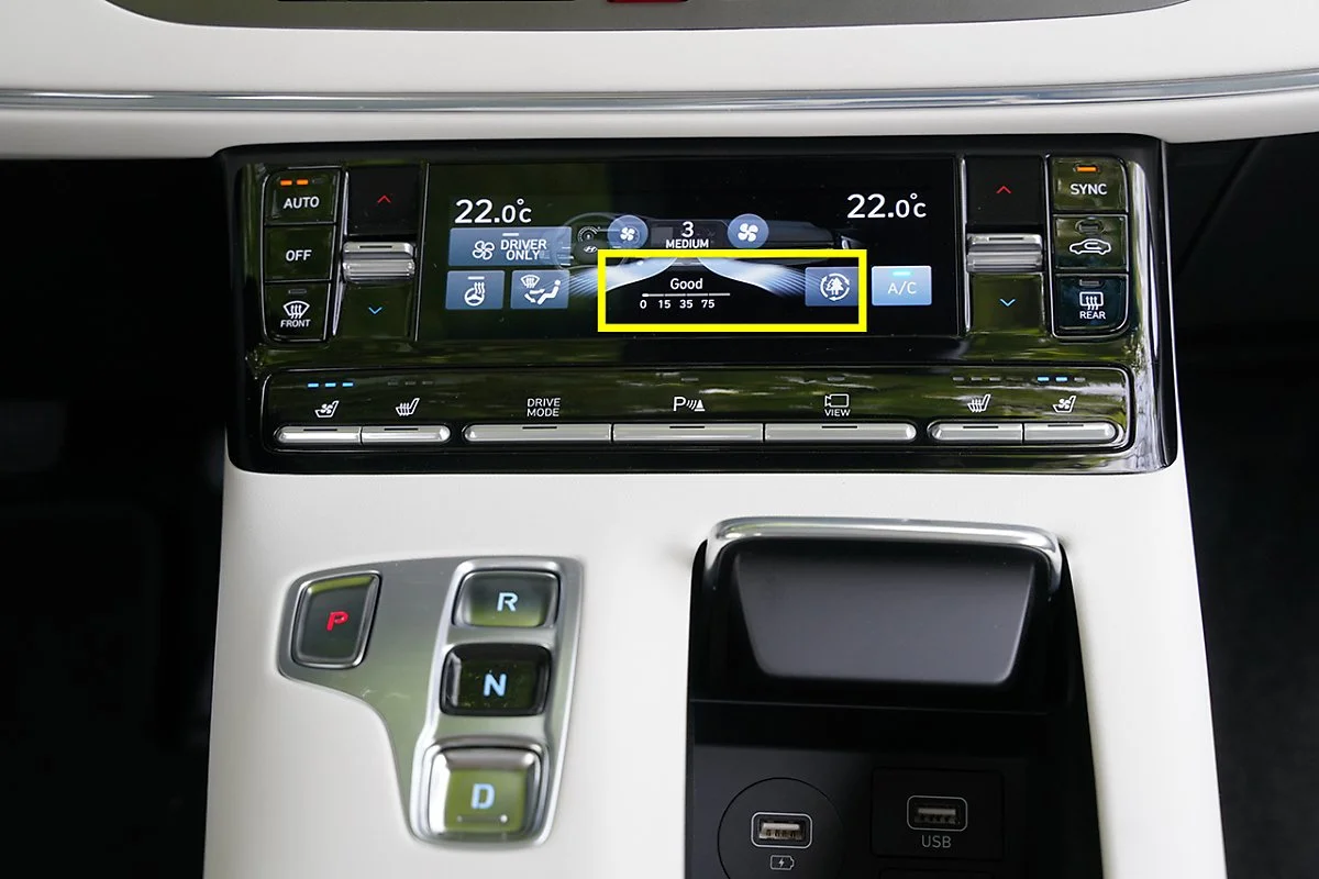 이후 현대차는 2019년 5월 차량 내부의 미세먼지 상태를 실시간으로 모니터링해서 정화해 주는 지능형 공기 청정 시스템을 개발했습니다. 차량 내 공기질은 한국환경공단에서 설정한 미세먼지 표현 방식에 따라 레이저 센서를 활용해 매우 나쁨, 나쁨, 보통, 좋음 4단계로 표시합니다. 미세먼지 포집률을 높이기 위해 헤파필터 등급 E10에 준하는 콤비 필터도 개발해 신차에 적용하기 시작했습니다.