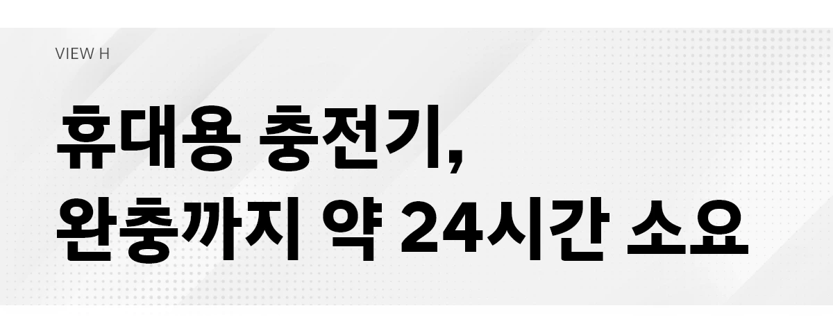 3kW의 휴대용 충전기로 아이오닉 5의 72.6kWh 용량의 배터리를 방전상태에서 완전히 충전하는데 필요한 시간은 이론상 약 24시간 이상입니다. 휴대용 충전기는 충전 시간이 가장 길지만, 220V 전원 사용이 가능하고, 휴대성이 뛰어나기 때문에 거주지에 충전기 설치에 제약이 있는 운전자에게는 좋은 대안입니다.