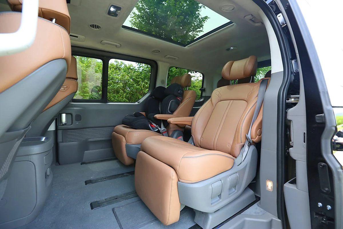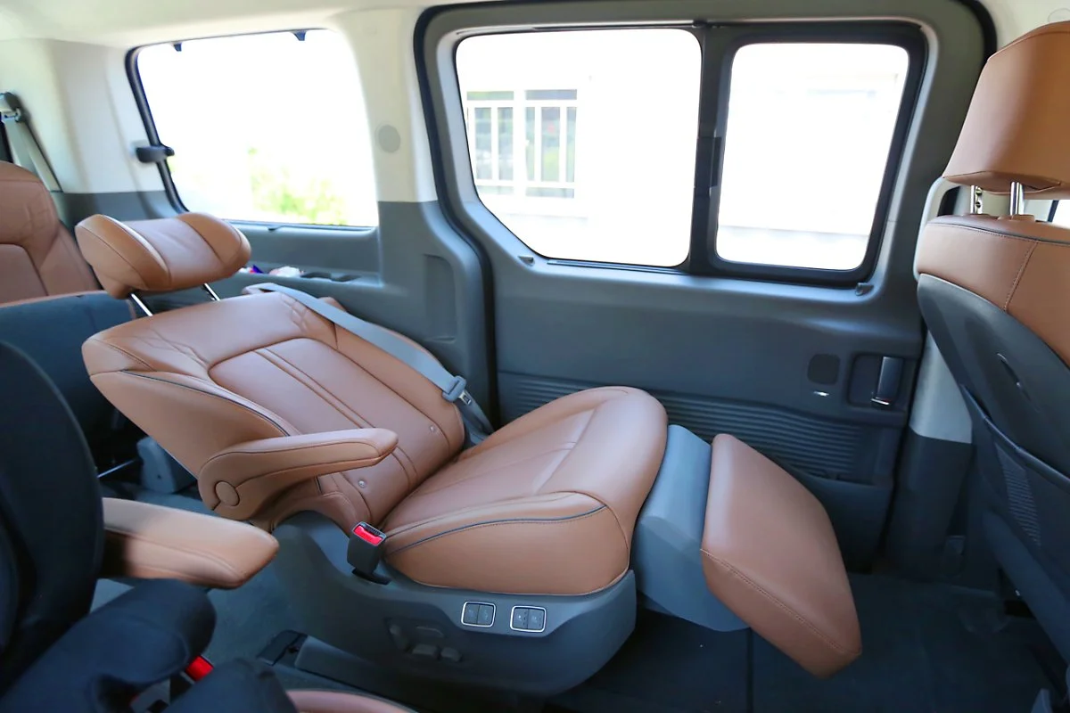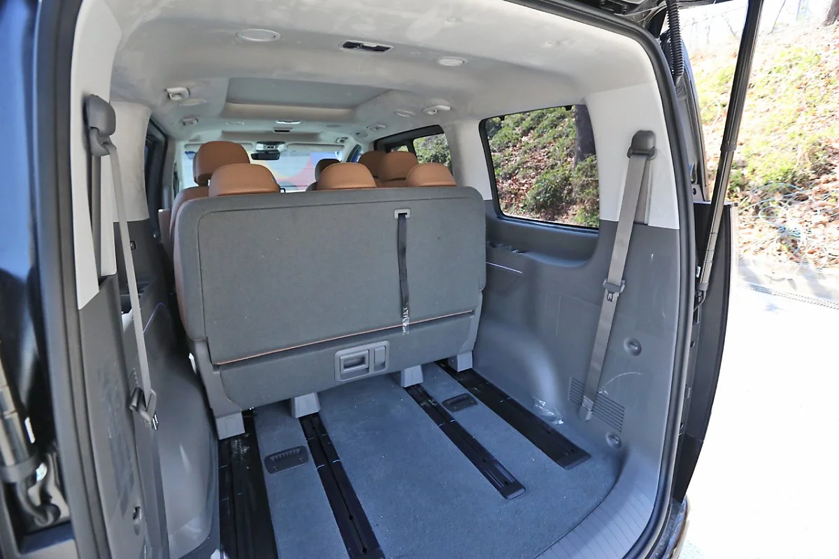 9인승 모델은 2열에 프리미엄 릴렉션 시트 보다 작은 스위블링 독립 시트가 장착됩니다. 그러나 이 시트 역시 다른 미니밴이나 대형 SUV 2열 좌석만큼 넉넉한 크기로 제공되며, 통풍과 열선 기능까지 모두 활용할 수 있습니다. 등받이 각도 또한 SUV 대비 넓은 폭으로 조절이 가능합니다. 또한 2열 좌측의 레그룸도 부족함은 없지만, 특히 우측 좌석은 조수석을 앞으로 당기면 성인 남성도 다리를 뻗을 수 있을 만큼의 레그룸이 확보되기 때문에 장거리 운행 시에도 여유로운 공간감을 제공합니다.