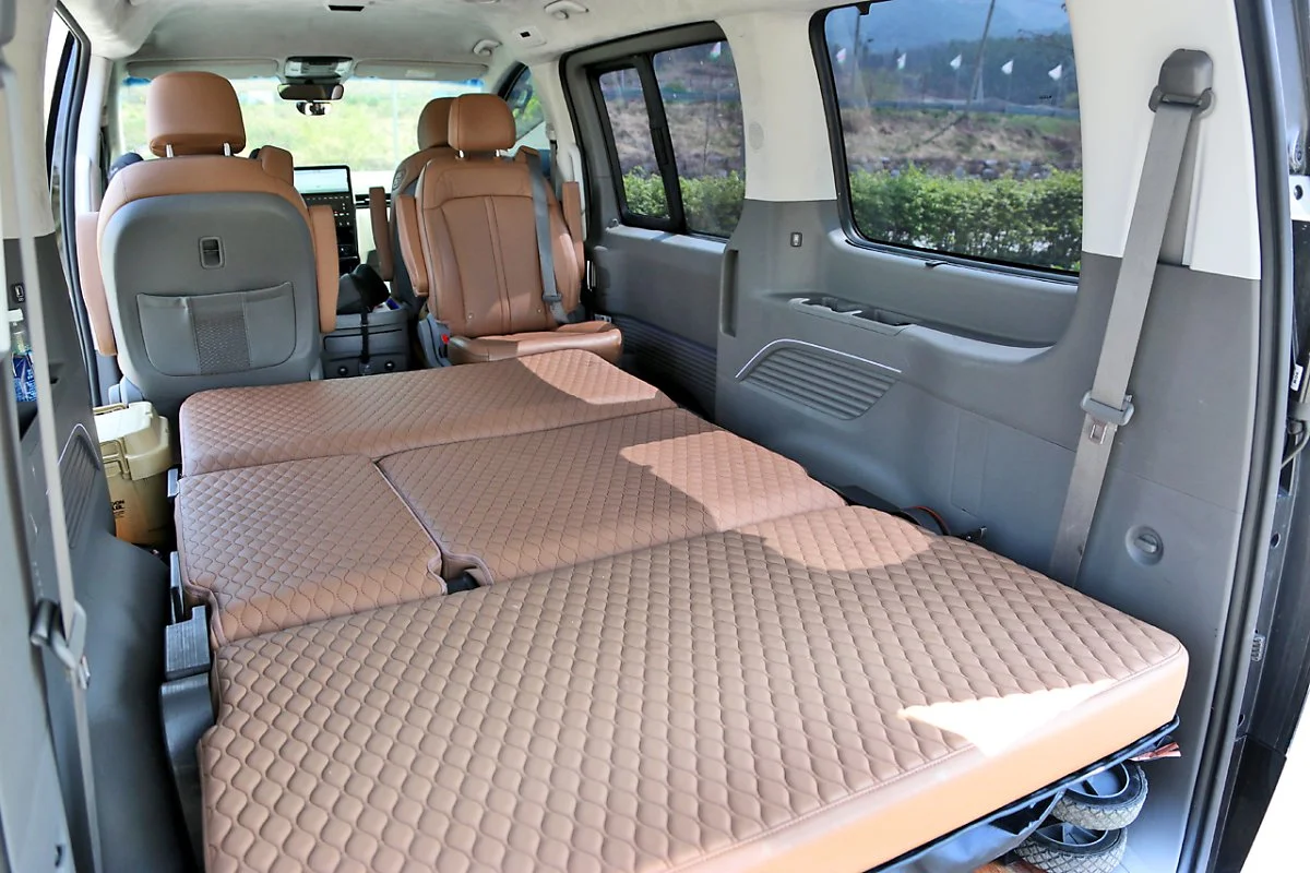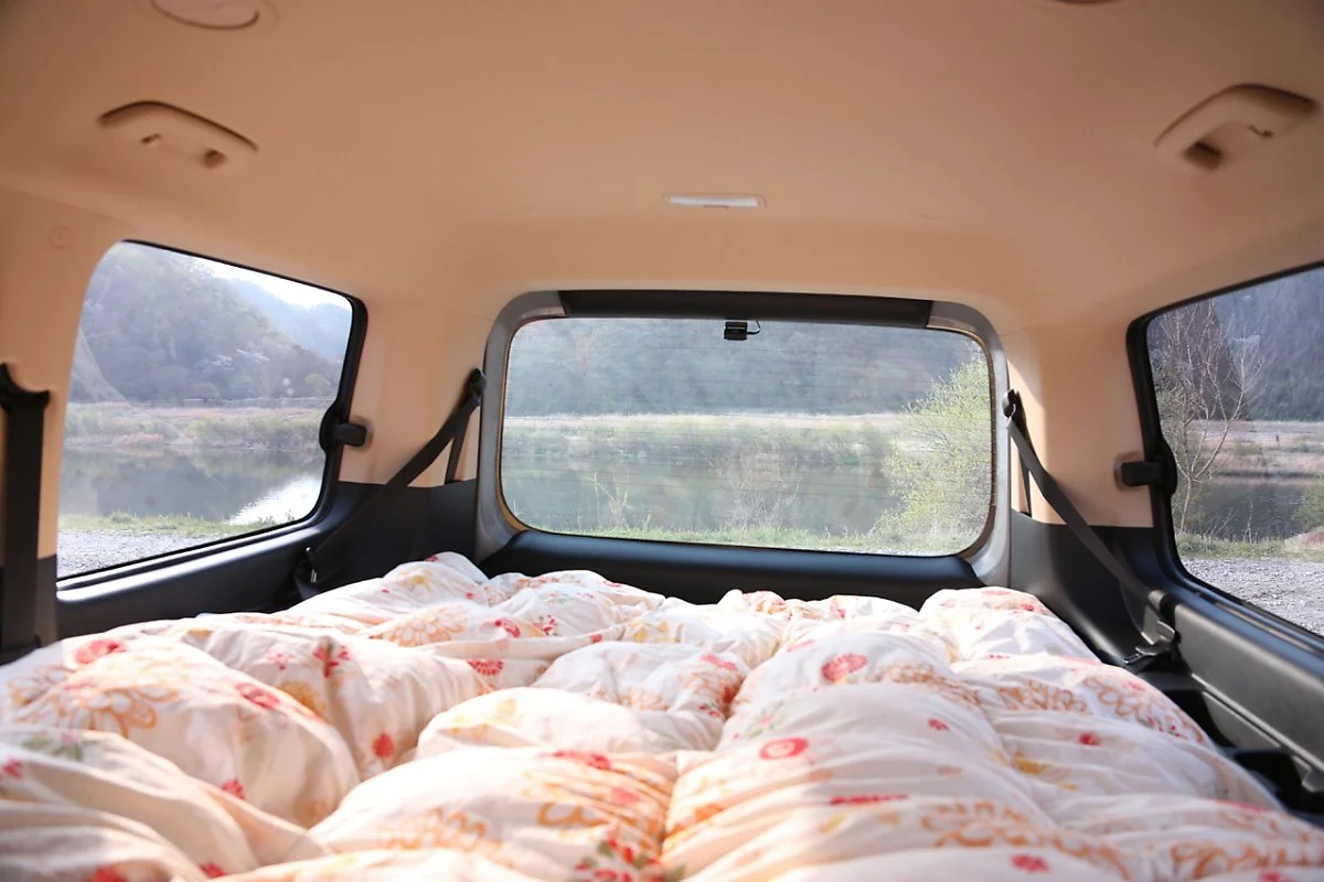 투어러 오너 : 공간감이 굉장히 좋아요. 9인승 시트를 모두 앞으로 접어 둔 상태에서 별도의 개조 없이 몇 가지 장비로 침대를 만든 겁니다. 앉을 수는 없지만, 그래도 성인 2명이 자기에는 충분하죠. 누었을 때 바깥 풍경이 시원하게 보이니까. 어디서나 스위트룸이 따로 없습니다.