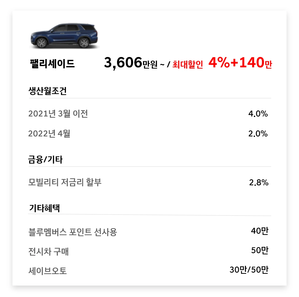 현대자동차의 ‘이달의 구매혜택(5월)’을 살펴보면 팰리세이드의 할인율은 매우 높은 편입니다. 생산월조건에 따라서 최대 4%까지 할인이 적용되고, 블루멤버스 포인트 선사용 같은 기타 혜택을 더하면 140만 원의 추가혜택까지 누릴 수 있습니다. 즉, 4%에 140만 원까지 추가 혜택을 챙길 수 있는 셈이죠. 이 정도 할인이라면 중고차를 구입하는 것보다 신차 출고가 낫지 않을까요?