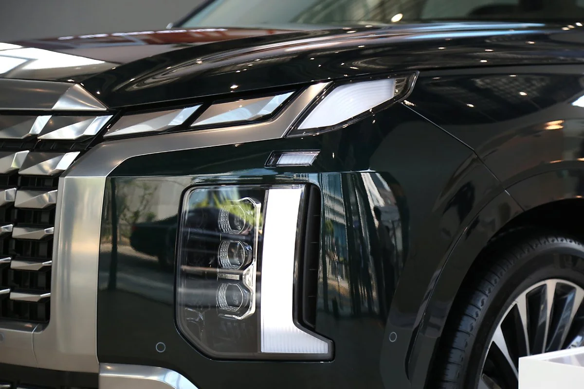 또, 팰리세이드만의 특징인 분리형 헤드램프와 세로형 DRL로 독특한 디자인을 완성시켰습니다. 분리되어 있지만 마치 시각적으로 연결되어 있는 듯한 효과를 줘 흥미로운 구성을 만들었습니다. 국내형과 북미형의 DRL 라이트 디자인에 약간의 차이가 있었는데요. 이는 나라별 법규를 충족시키기 위한 조치를 디자인적으로 풀어낸 것입니다. 국내 법규상 주간 주행 등은 좌우 1개씩 설치되어야 하지만, 주간주행등 간 간격이 75mm 이하라면 2~3개의 등화장치가 상호의존 등화로 분류돼 하나의 등화장치로 인정되기 때문입니다.