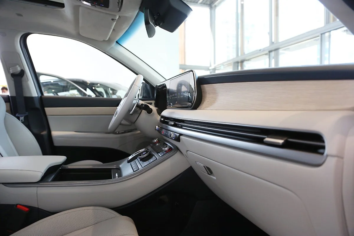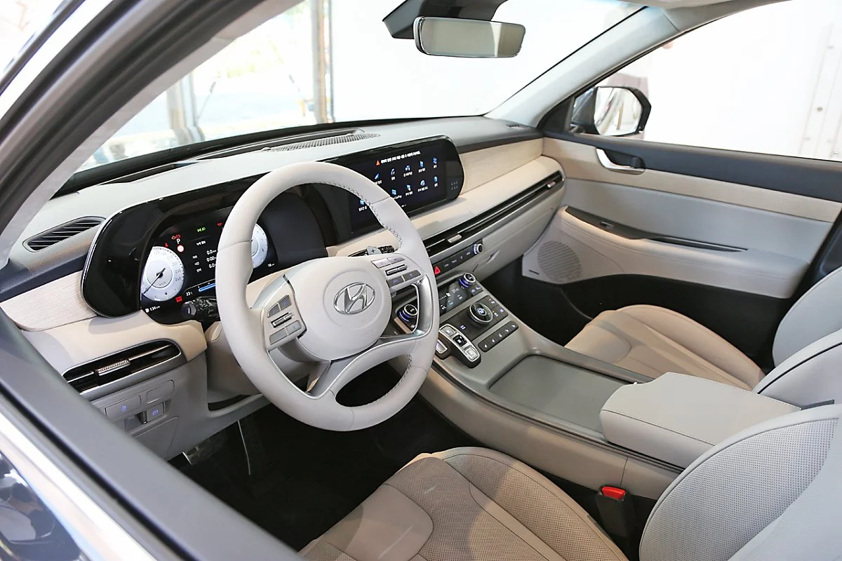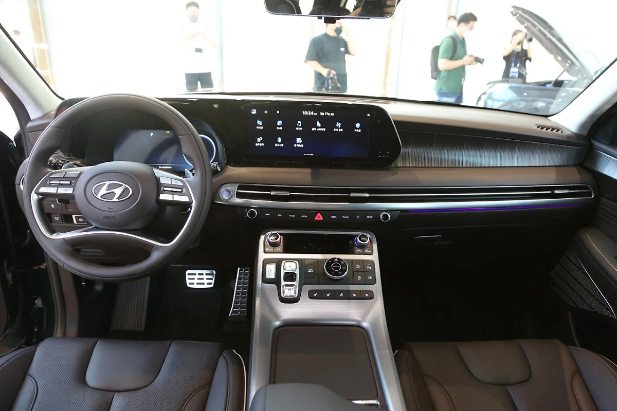 실내 디자인은 기존에서 완성도를 더욱 높이는 데 주력했습니다. 가장 눈에 띄는 시각적 변화는 스티어링 휠과 송풍구 에어벤트 디자인입니다. 최신 디자인의 스티어링 휠이 더 뉴 팰리세이드에도 적용되었는데, 타원 형태의 중앙부 디자인이 로고 디자인과 조화를 이루는 모습이 돋보입니다.