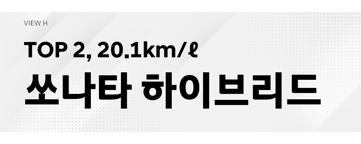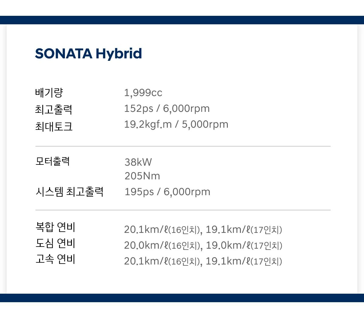 쏘나타 하이브리드의 복합연비는 20.1km/ℓ(16인치 휠)를 발휘합니다. 17인치 휠을 장착한 모델은 복합연비 19.1km/ℓ를 기록하며, 이는 12.7km/ℓ를 기록하는 스마트스트림 가솔린 2.0 대비 50.3% 앞서는 수치입니다. 13.8km/ℓ를 기록하는 스마트 스트림 가솔린 1.6 모델과 비교해도 효율성이 38% 앞서고, 복합연비 km/ℓ를 기록하는 스마트 스트림 LPi 2.0 모델과 비교해서는 87.2%가 우수합니다.