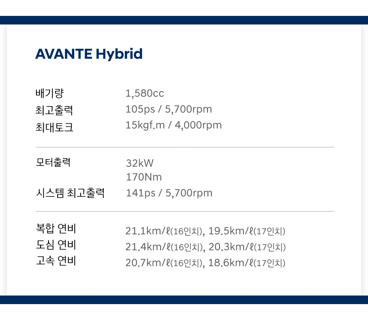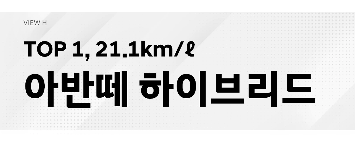 국내 대표 준중형 세단 아반떼의 하이브리드 모델은 16인치 휠 장착 모델 기준 복합연비 21.4km/ℓ의 우수한 연비를 자랑합니다. 이는 일반 내연기관 모델인 아반떼 스마트스트림 가솔린 1.6 모델의 복합연비(14.9km/ℓ, 16인치 휠)보다 약 43.6% 우수하며, LPi 1.6 모델의 복합연비(10.5km/ℓ, 16인치 휠)보다 2배 넘게 우수합니다. 특히 아반떼 하이브리드의 도심 연비는 21.4km/ℓ로 우수한 도심 주행 연비를 달성했습니다.