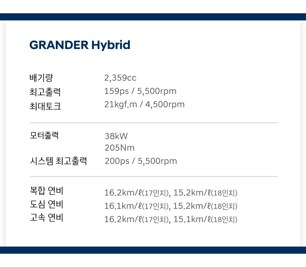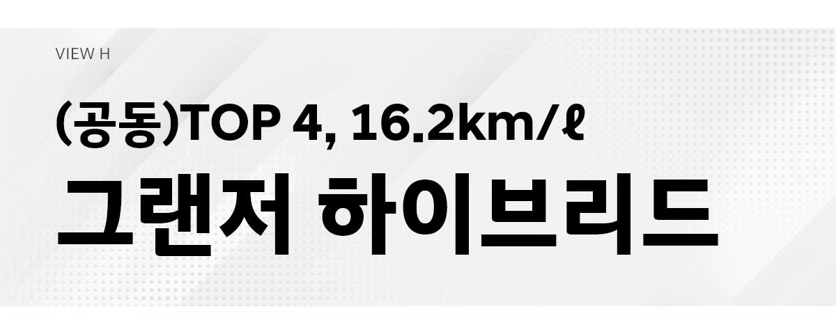 현대자동차의 플래그십 세단 그랜저의 친환경 모델인 그랜저 하이브리드의 복합연비는 17인치 휠 모델을 기준으로 16.2km/ℓ입니다. 일반 내연기관 모델과 비교하면 스마트스트림 2.5 모델의 복합연비 11.9km/ℓ 대비 36.1%가 높고, LPi 3.0 모델의 복합연비 7.5km/ℓ와 비교하면 무려 두 배 이상 높습니다. 그랜저 라인업 중 가장 배기량이 높은 가솔린 3.3 모델의 18인치 휠 모델과 비교해서는 복합 연비 9.7km/ℓ보다 67% 높은 연비를 제공합니다.