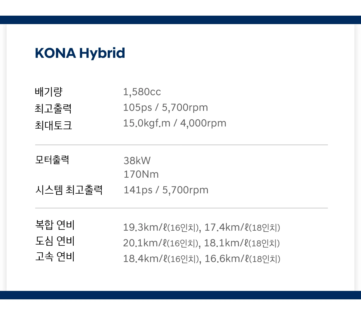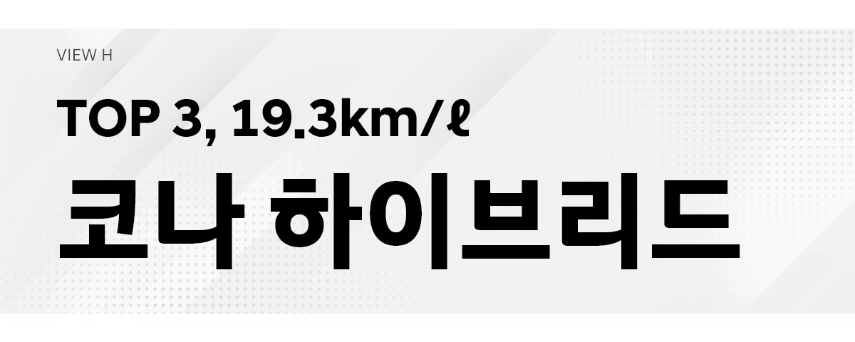 현대자동차 소형 하이브리드 SUV인 코나 하이브리드의 복합연비는 16인치 휠 기준 19.3km/ℓ입니다. SUV 중 높은 연비를 제공하는 코나 하이브리드는 스마트스트림 가솔린 1.6 터보 모델의 복합연비(13.9km/ℓ)보다 38.8% 높고, 스마트스트림 가솔린 2.0 모델의 복합연비(13.6km/ℓ) 대비 41.9% 높습니다. 특히 코나 하이브리드의 주행 상황 별 연비는 도심 20.1km/ℓ, 고속도로 18.4km/ℓ로 도심에서 우수한 연비를 제공합니다.