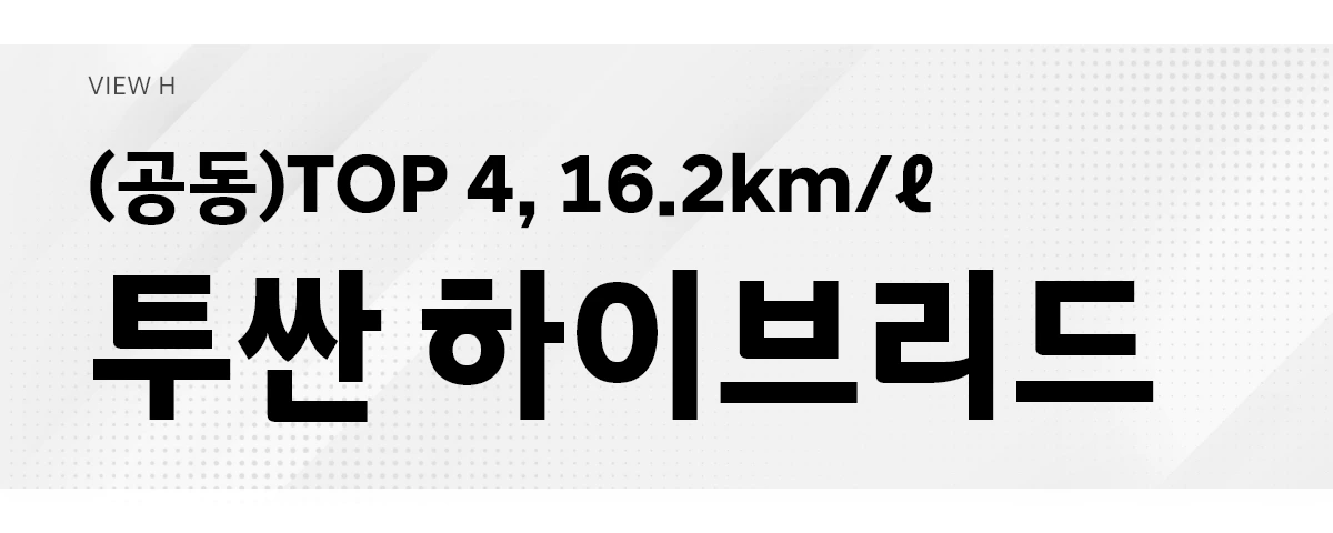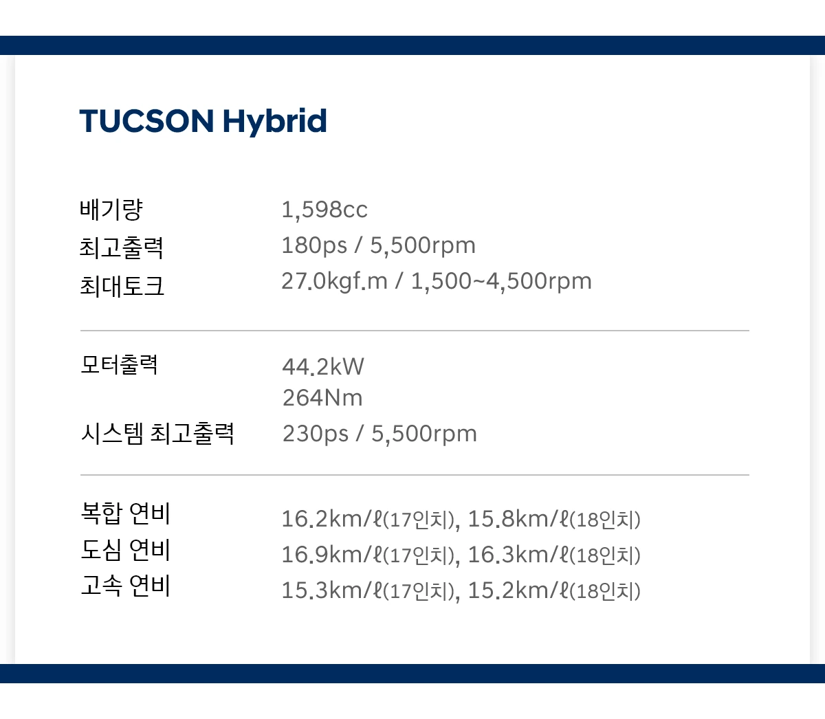 투싼 하이브리드는 스마트스트림 가솔린 1.6 터보 하이브리드 파워트레인을 사용합니다. 복합연비는 17인치 휠과 18인치 휠 모두 16.2km/ℓ을 기록합니다. 이는 기본 가솔린 모델인 스마트스트림 가솔린 1.6T 모델의 복합연비 12.5km/ℓ 대비 29.6% 높은 수치입니다. 또한 연비가 우수한 스마트스트림 디젤 2.0 17인치 휠 적용 모델의 복합연비 14.8km/ℓ와 비교해도 9.4% 높은 수준입니다.