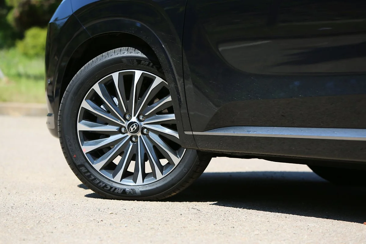 측면에서는 신규 20인치 휠이 적용되었습니다. 기존 디자인은 역동적으로 표현되었다면 더 뉴 팰리세이드의 20인치 휠은 스포크가 얇고 많아지면서 고급스러운 분위기가 강조되었습니다. 그리고 측면에서의 고급스러운 분위기를 강조하기 위해 라디에이터 그릴의 측면 디자인도 더 깔끔하게 다듬었습니다. 기존 모델의 라디에이터 그릴 측면 디자인이 울퉁불퉁했다면 이번에는 깔끔하게 떨어지도록 한 것이죠.