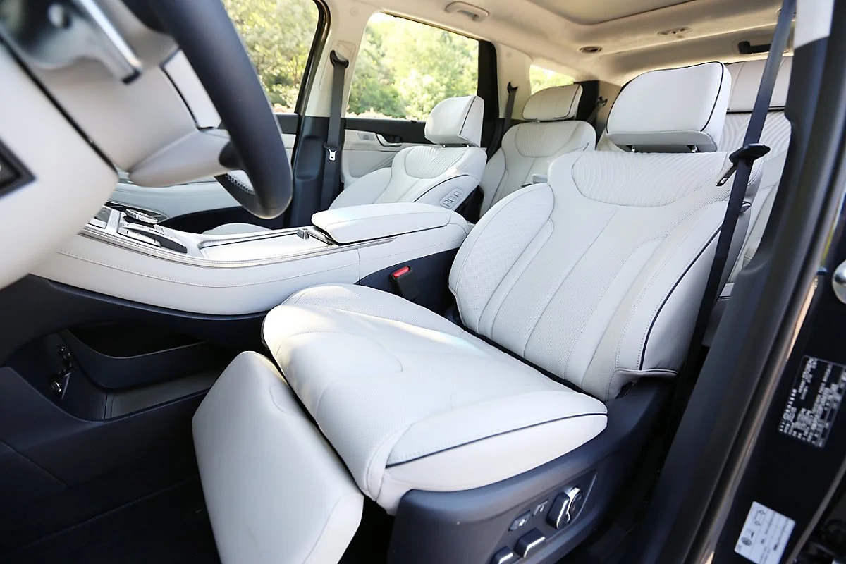 팰리세이드는 승차감도 개선되었지만 운전석에는 에르고 모션 시트가 장착되어 장시간 운전에도 부담이 없습니다. 이 시트는 운전석에 7개(등/옆구리/엉덩이 부분)의 공기주머니를 활용해 주행 시 안락하며, 세밀한 조절을 통해 최적의 착좌감까지 구현할 수 있는데요. 공기주머니 개별 제어를 통해 스트레칭 모드도 사용할 수 있습니다. 운전석과 함께 조수석도 레그레스트가 포함되며, 릴렉션 컴포트 시트가 적용되어 최적의 자세로 휴식을 취할 수 있습니다.