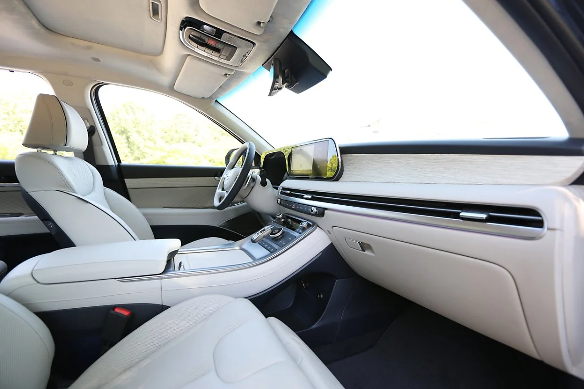 더 뉴 팰리세이드는 이렇게 넓은 공간에 프리미엄 감성을 가득 채웠습니다. 캘리그래피 트림의 내장 컬러는 블랙 원톤, 브라운, 웜그레이 등 3가지로 구성됩니다. 시승차는 이 중에서도 웜그레이가 적용되어 있습니다. 그래서 스티어링 휠은 투톤 가죽 스티어링 휠이 적용되고, 도어 하단부나 크래시패드는 오염에 강한 투 톤이 적용됩니다. 또한 콘솔 커버 리얼 알루미늄과 함께 적용된 인조가죽 감싸기는 고급감을 더욱 높여줍니다.