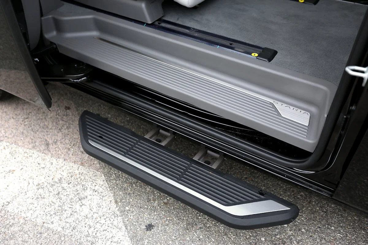 스타리아 라운지 리무진은 2열에 집중된 특화 사양이 적용됩니다. 2열 스마트 파워 슬라이딩 도어와 연동돼 도어 개폐 시에 모습을 드러내는 조수석 방향 2열 전동식 사이드 스텝은 탑승 편의성을 높여주고 탑승객에게 고급감을 선사합니다.