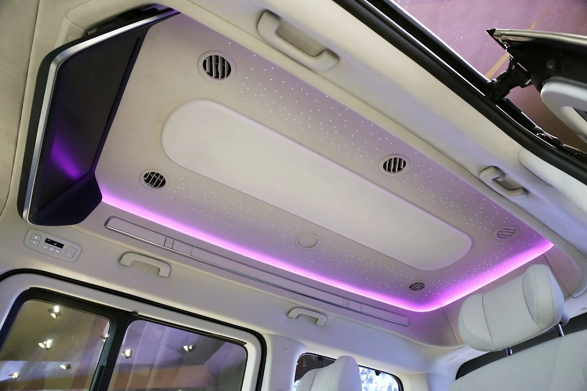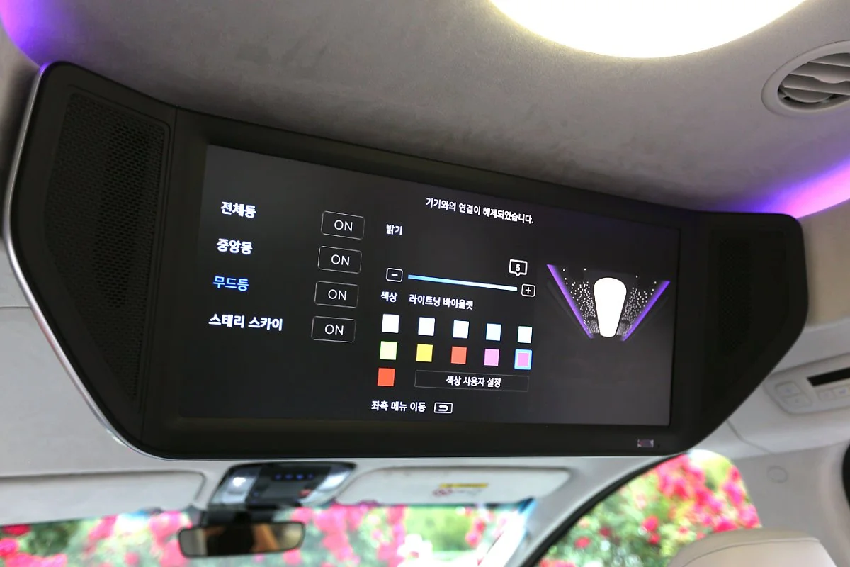 거대한 스타리아 라운지 리무진의 천장에는 스태리 스카이 무드 조명이 적용돼 실내 분위기를 한층 더 고급스럽게 만들어 줍니다. 밤하늘 별 같은 조명과 함께 거대한 무드 조명은 탑승자의 필요에 따라 스태리 조명, 중앙등, 다양한 색상의 무드등을 각각 별도로 제어할 수 있습니다. 덕분에 다양한 분위기의 실내를 연출할 수 있으며, 2열 프리미어 릴렉션 시트와 함께 안락한 휴식 공간을 만드는데 일조합니다.