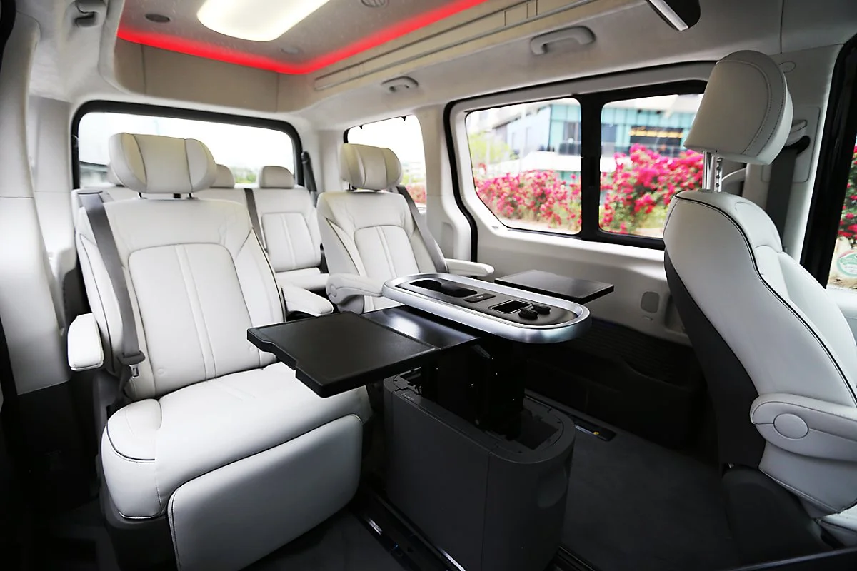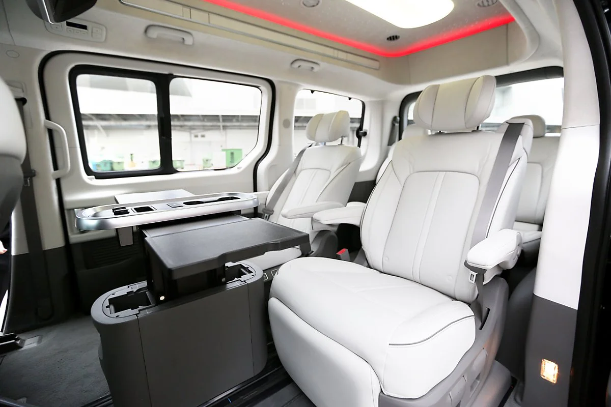 스타리아 라운지 리무진의 대표적인 전용 사양인 무버블 콘솔은 팝업 테이블, 컵홀더, 리모컨 홀더, 2개의 C타입 USB 충전기, 220V 인버터 등이 통합된 것이 특징입니다. 7인승 모델의 무버블 콘솔은 1열부터 2열까지 이동할 수 있어 높은 편의성을 자랑합니다. 특히 손쉬운 작동 방법과 적당한 크기의 팝업 테이블은 탑승자들이 업무를 보거나, 휴식을 할 때 모두 편안하게 활용할 수 있습니다.
