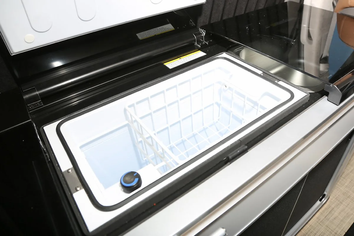 주방에는 싱크 수전 세트와 접이식 실내 테이블, 36ℓ 빌트인 냉장고로 구성되는데요. 평상시에는 바처럼 넓게 활용할 수 있고, 필요에 따라 상부를 열어서 활용하는 방식입니다. 특히 빌트인 냉장고는 용량에 비해서 실용성이 매우 우수하고, 온도 조절이 가능하며, 살얼음이 발생할 정도로 성능이 우수합니다.